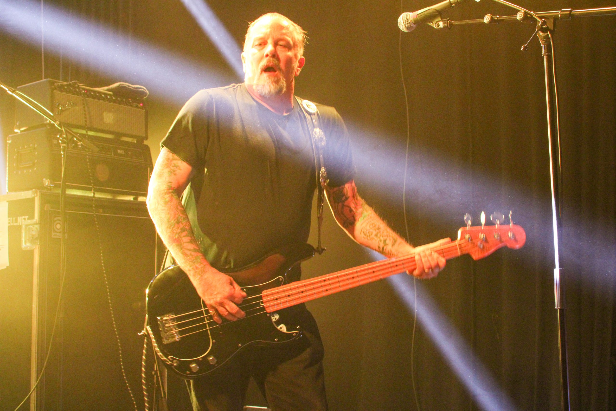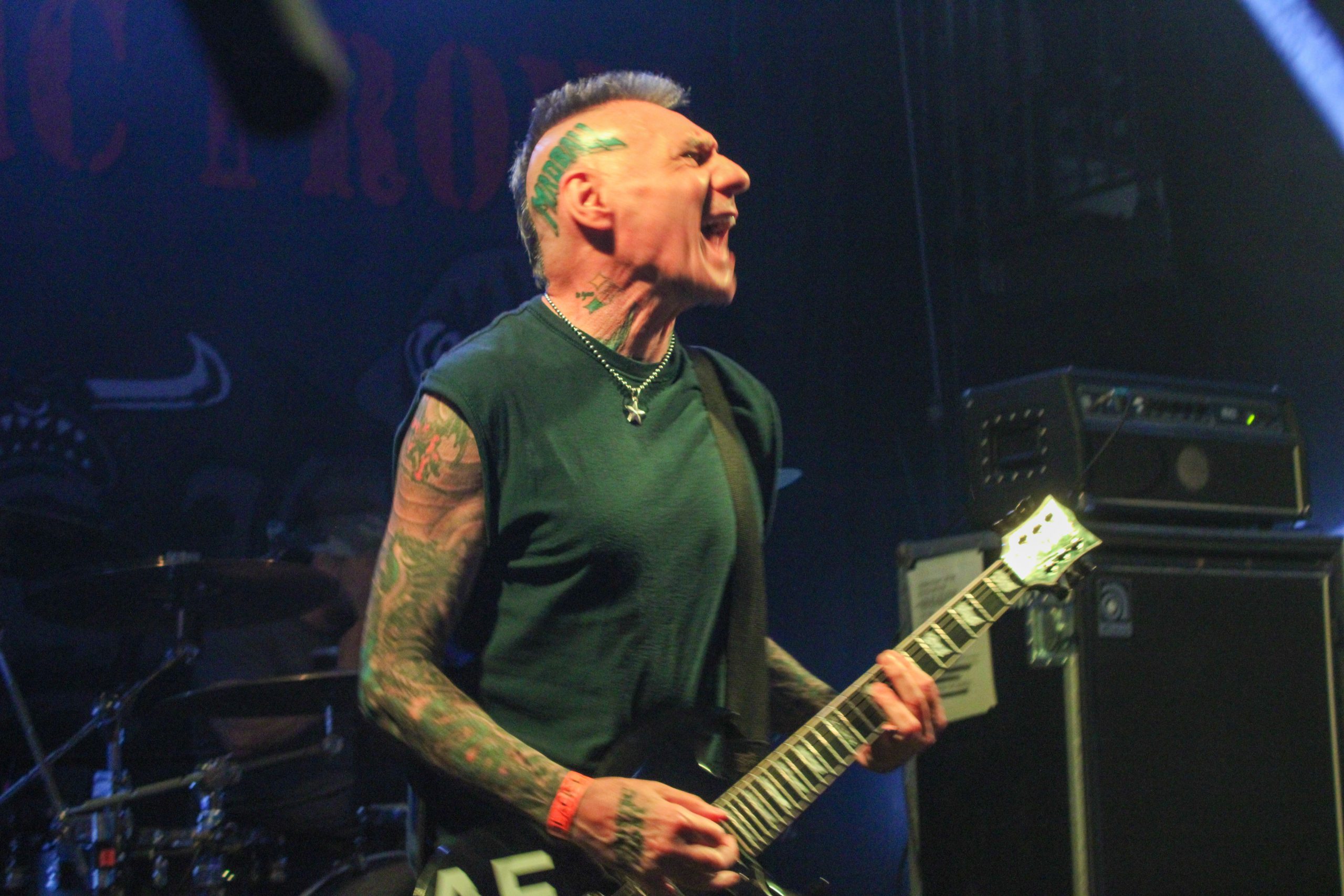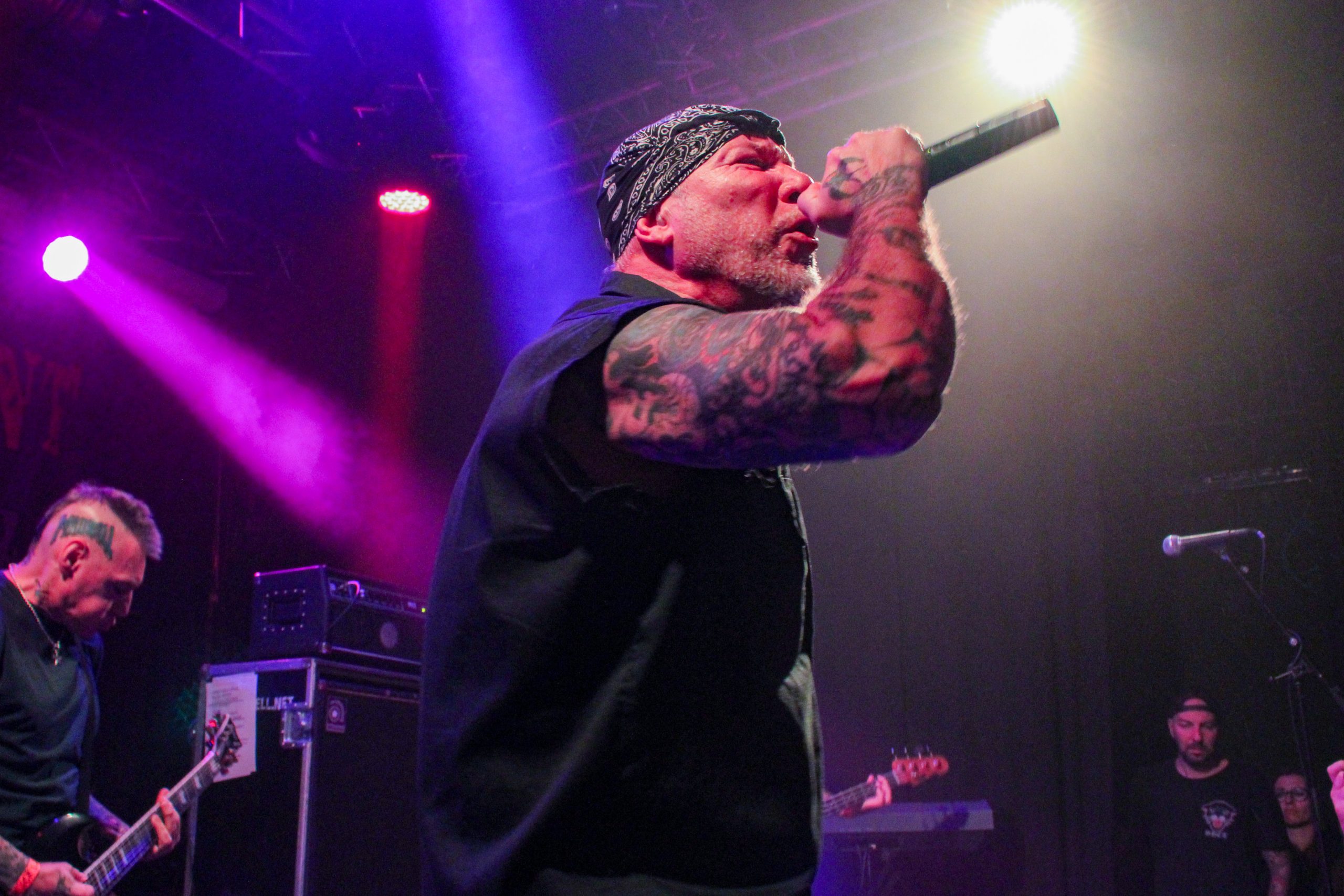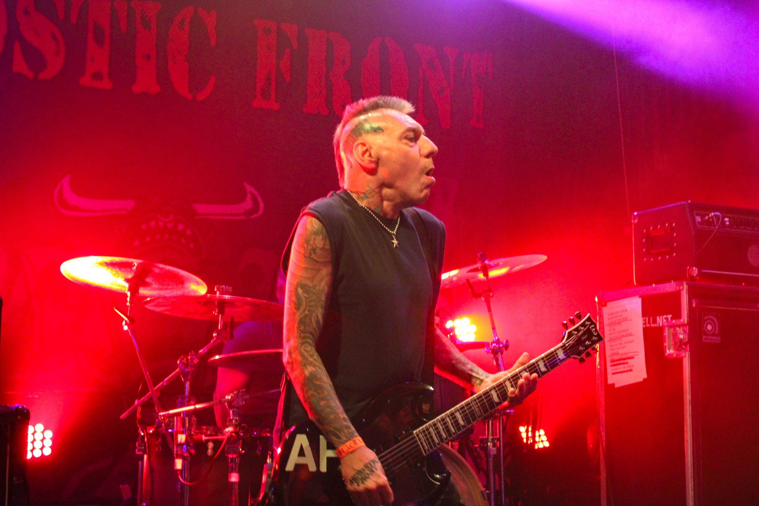 Et c’est parti pour Agnostic Front! D’entrée de jeu les américains envoient leur hardcore imparable, ce qui mettra la fosse en ébullition. L’énergie de Roger Miret (chant) est absolument dingue, il court partout et harangue la foule pour une proximité totale avec le public. Les musiciens ne sont pas en reste et bougent dans tous les sens, de vraies piles électriques! Vinnie Stigma (guitare) a fait son show avec une guitare gonflable dès le début du concert pour amuser la galerie. L’ambiance est excellente, et on sent que tout le monde aussi bien sur scène que dans la salle ou derrière le bar passe une super soirée! Le groupe alterne entre les morceaux de Get Loud! (2019) et des classiques de leur discographie, au grand plaisir des fans présents ce soir. De notre côté c’est notre première fois et clairement on adore passer ce moment avec les américains. Les pits sont incessants et les fans chantent en chœur les paroles. Tout le set est clairement une collection de hits en puissance et les fans se donnent à fond pour que l’ambiance soit inoubliable! La setlist stratosphérique de plus de 25 chansons en laissera plus d’un sur les rotules, mais nous sortons tous de la salle heureux d’avoir vécu cette soirée dans une atmosphère incomparable!