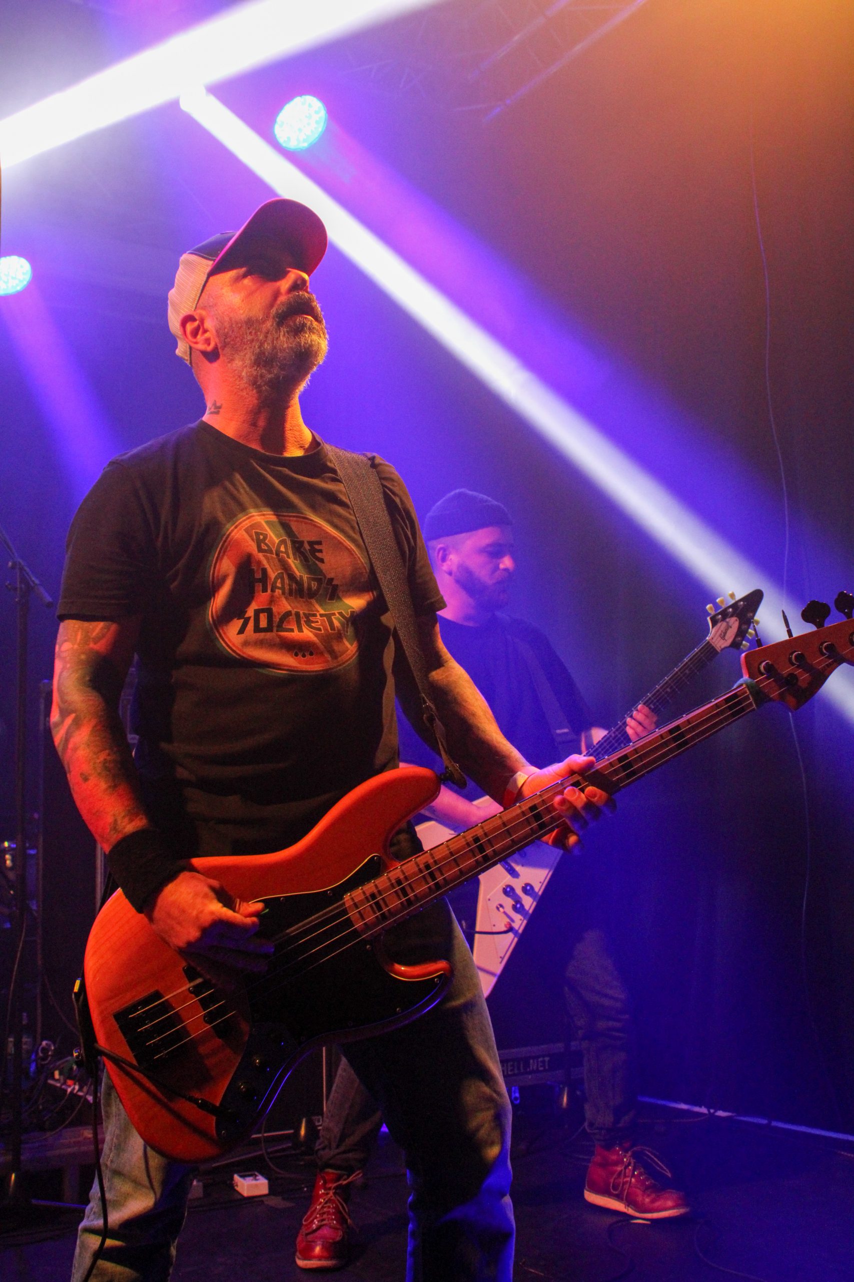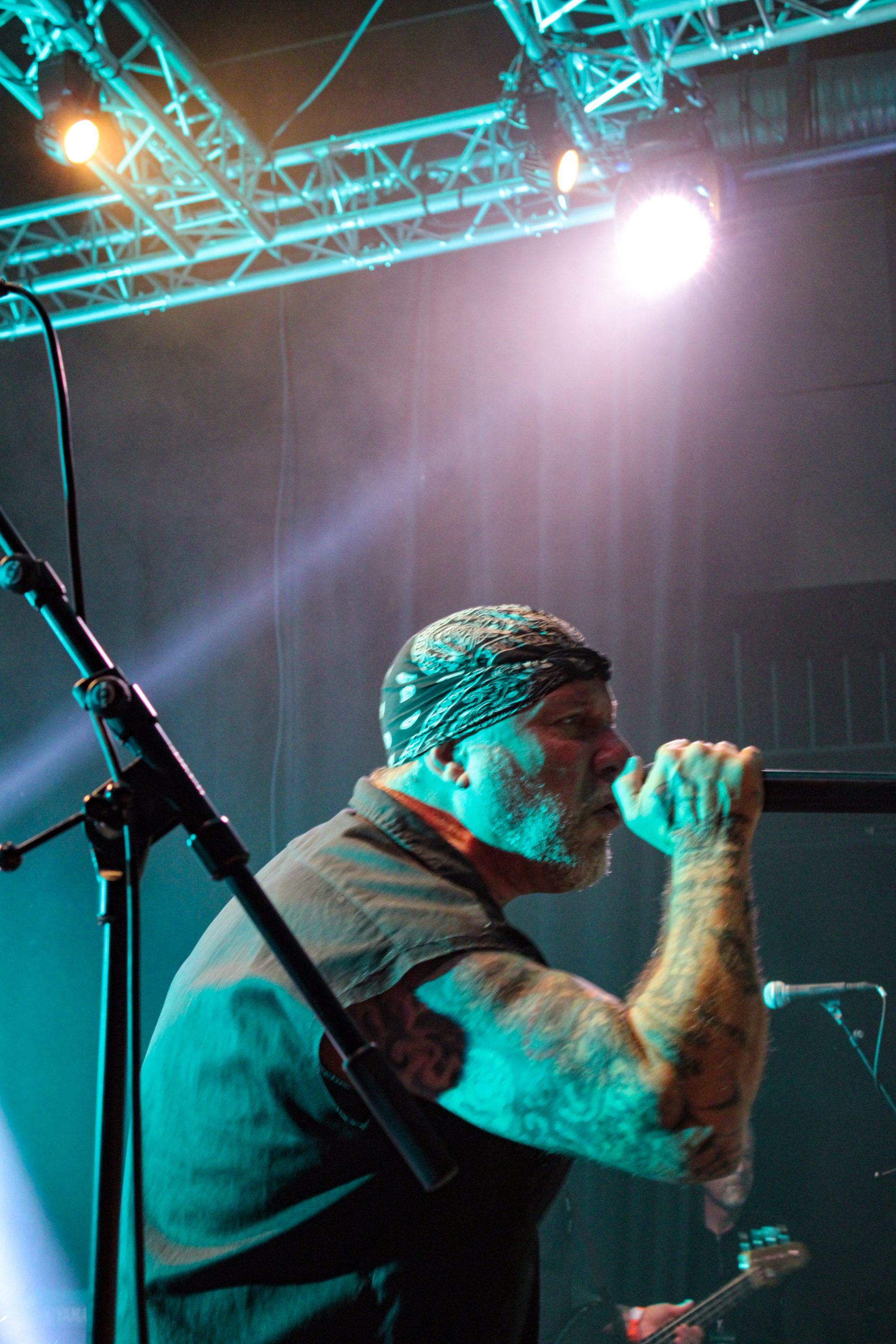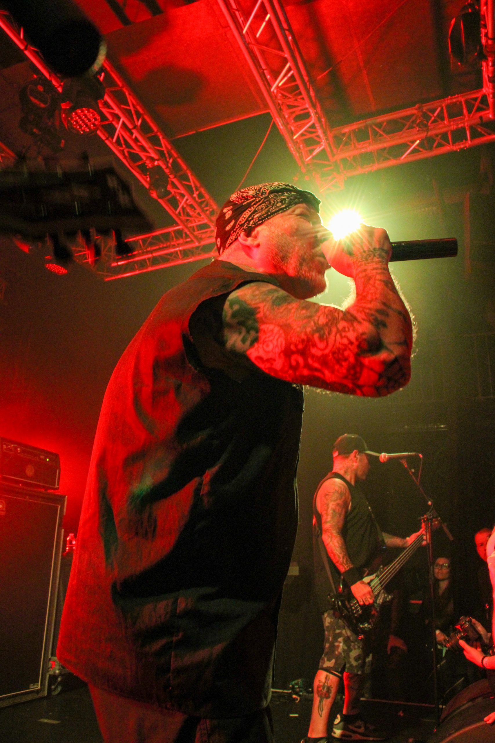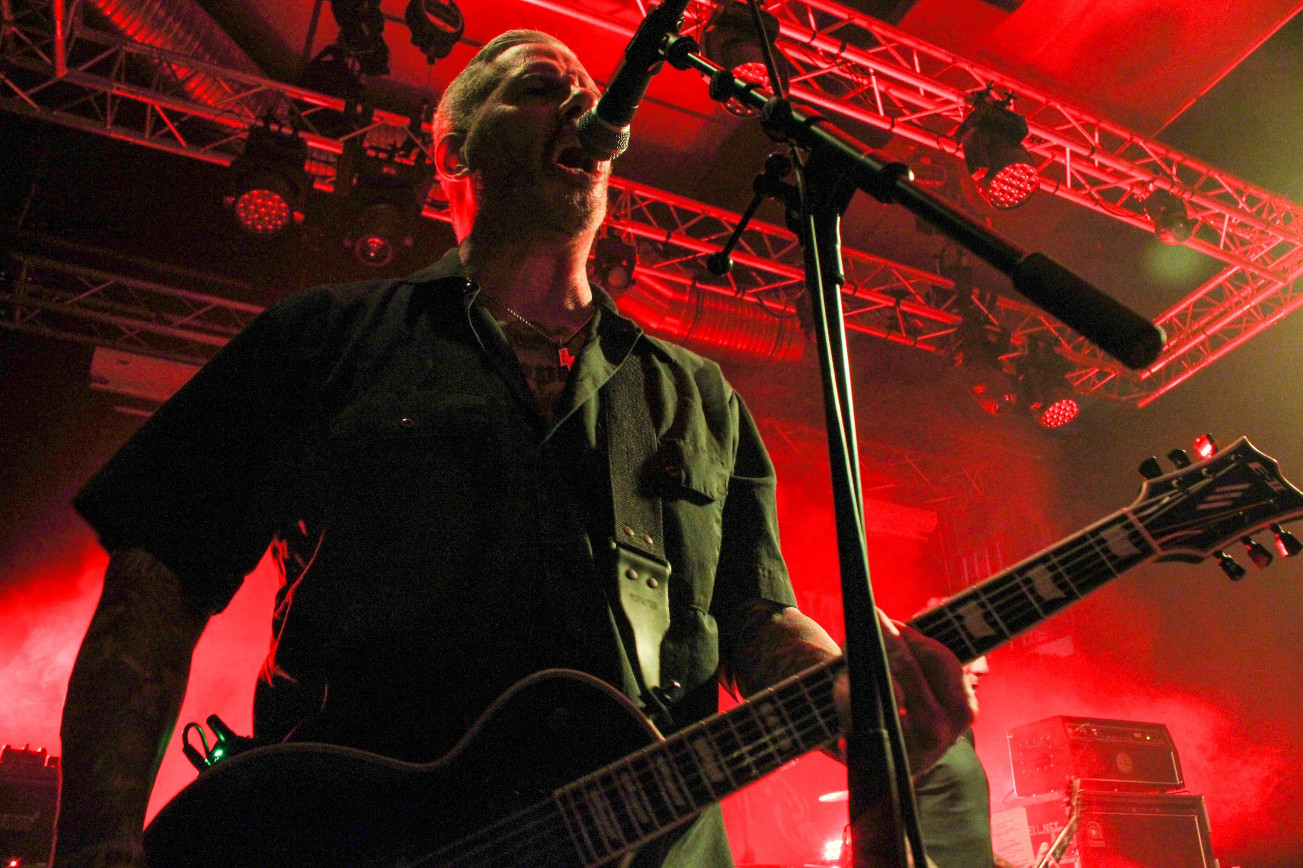 Et c’est parti pour Agnostic Front! D’entrée de jeu les américains envoient leur hardcore imparable, ce qui mettra la fosse en ébullition. L’énergie de Roger Miret (chant) est absolument dingue, il court partout et harangue la foule pour une proximité totale avec le public. Les musiciens ne sont pas en reste et bougent dans tous les sens, de vraies piles électriques! Vinnie Stigma (guitare) a fait son show avec une guitare gonflable dès le début du concert pour amuser la galerie. L’ambiance est excellente, et on sent que tout le monde aussi bien sur scène que dans la salle ou derrière le bar passe une super soirée! Le groupe alterne entre les morceaux de Get Loud! (2019) et des classiques de leur discographie, au grand plaisir des fans présents ce soir. De notre côté c’est notre première fois et clairement on adore passer ce moment avec les américains. Les pits sont incessants et les fans chantent en chœur les paroles. Tout le set est clairement une collection de hits en puissance et les fans se donnent à fond pour que l’ambiance soit inoubliable! La setlist stratosphérique de plus de 25 chansons en laissera plus d’un sur les rotules, mais nous sortons tous de la salle heureux d’avoir vécu cette soirée dans une atmosphère incomparable!