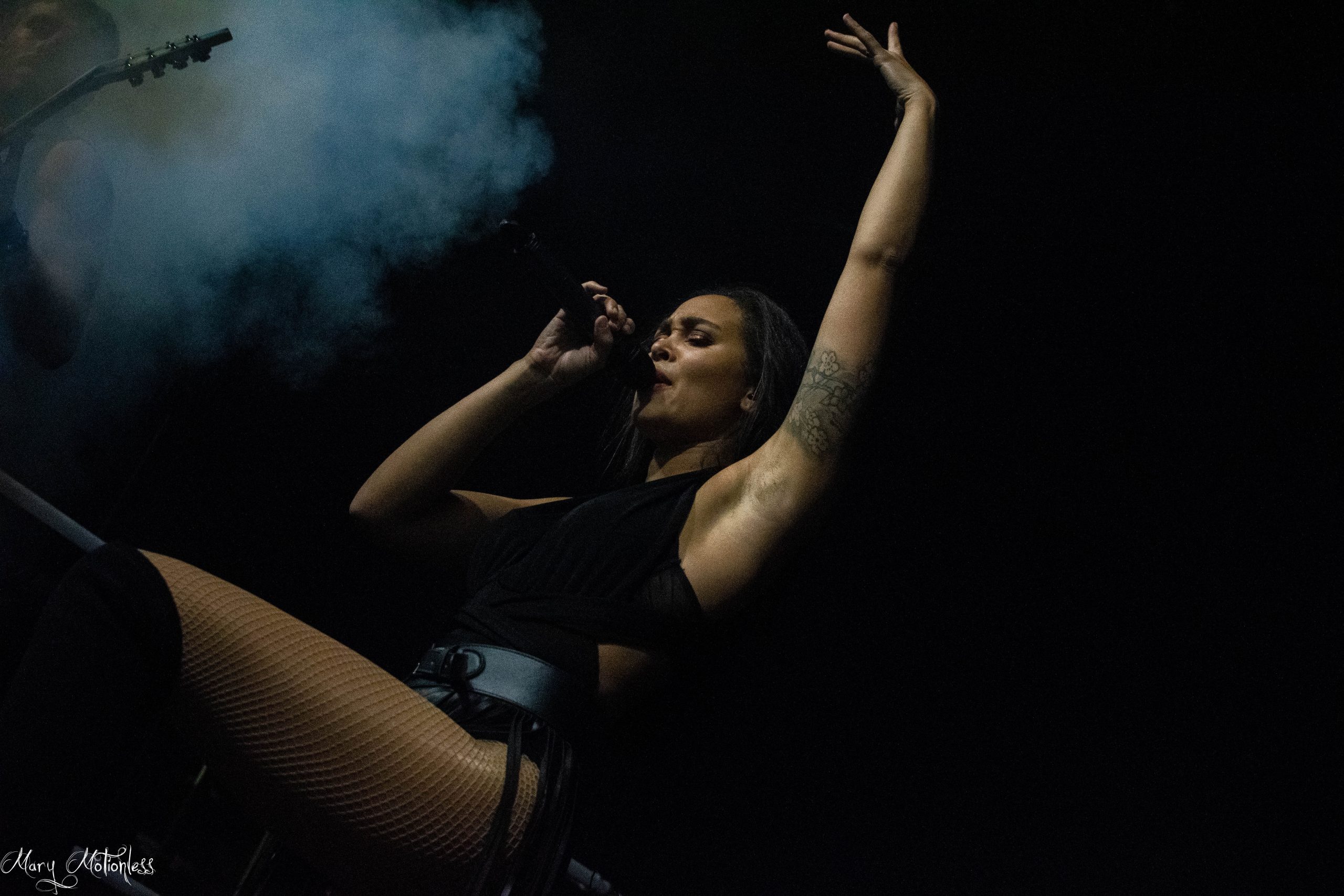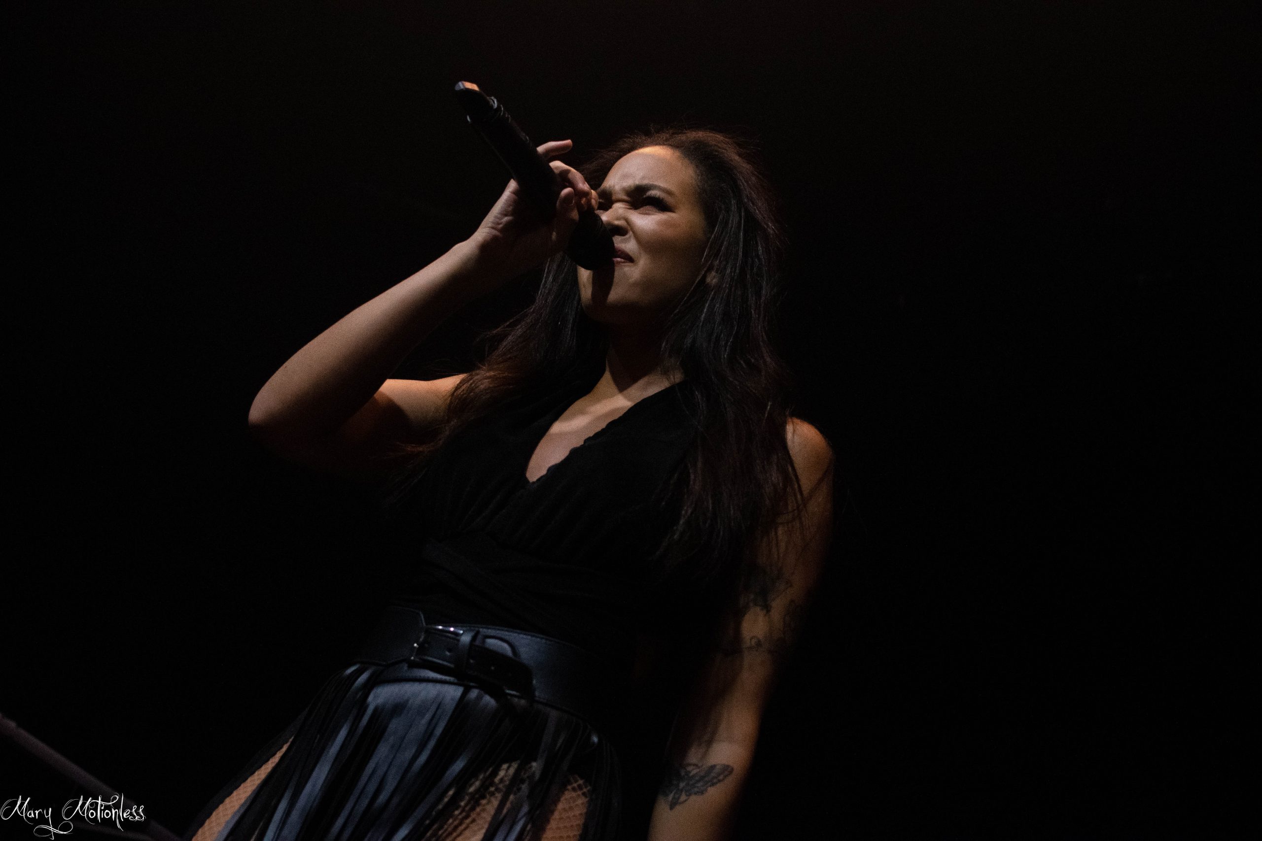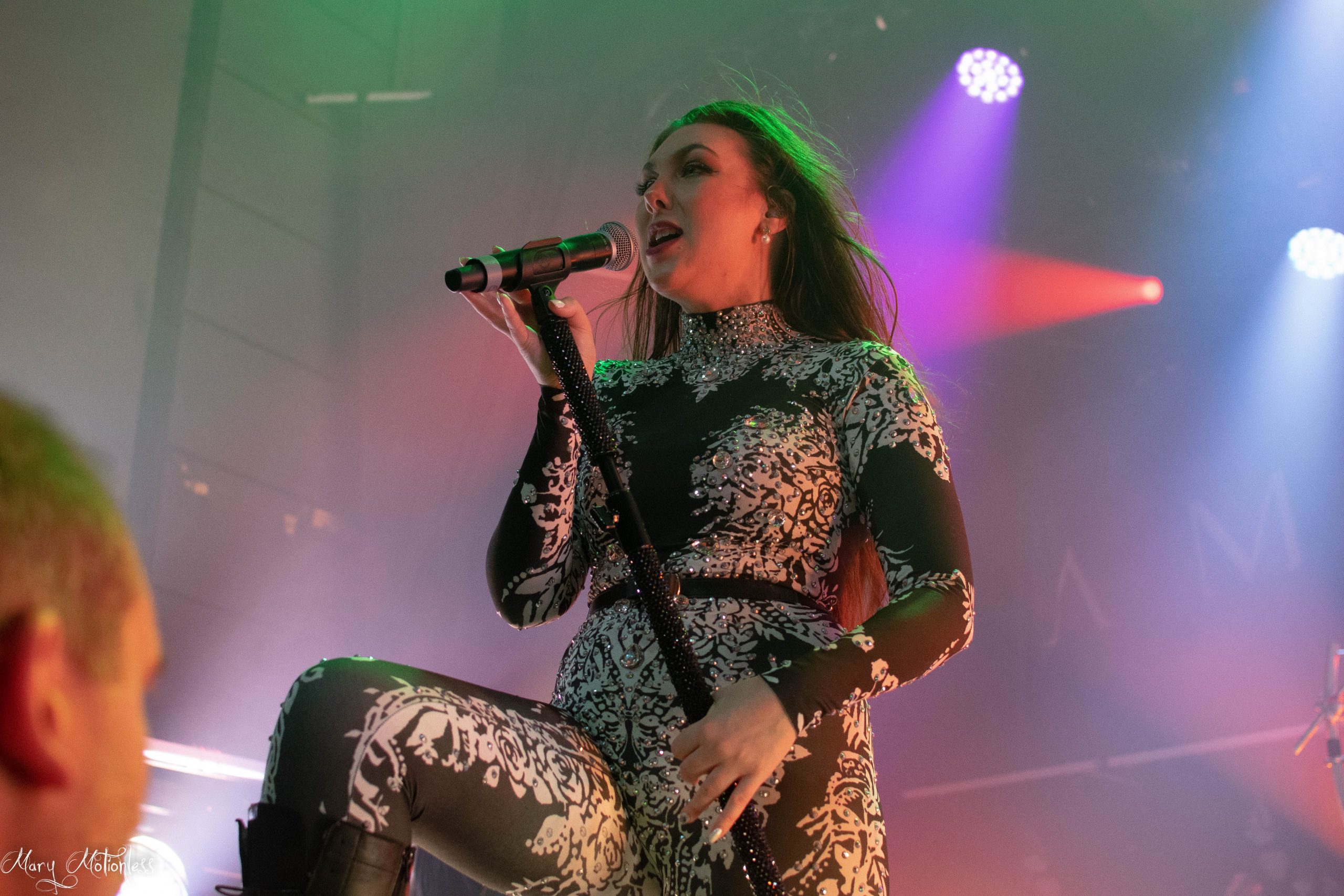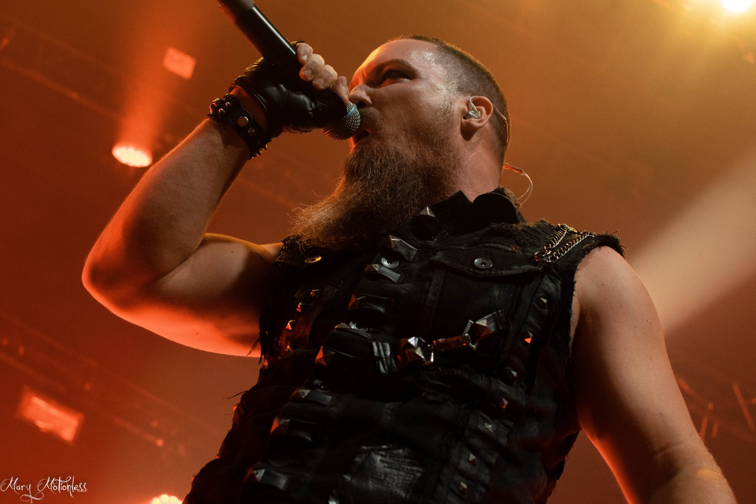 Le troisième groupe de la soirée est donc Beyond The Black. Les allemands arrivent sereins sur scène avec une décoration aux couleurs du groupe, tout comme leurs lumières qui offrent une immersion sans faille. La chanteuse ouvre d’ailleurs le bal avec Is There Anybody Out There en débarquant vêtue d’un costume noir et un long manteau noir mais surtout avec des néons qui en sont presque devenus indissociables. Jennifer Haben change même de tenue pour passer sur une robe rouge fendu sur la jambe puis exit la robe pour laisser place à un débardeur en dentelle noir et un short en simili, mais également un magnifique masque type esprit de forêt. Le public est très réceptif avec de nombreux nouveaux fans à leur actif. Ils ont créé la surprise en jouant deux titres (Reincarnation et Winter Is Coming) qui seront présents sur leur nouvel album éponyme qui sortira en janvier 2023 (Tiffany)