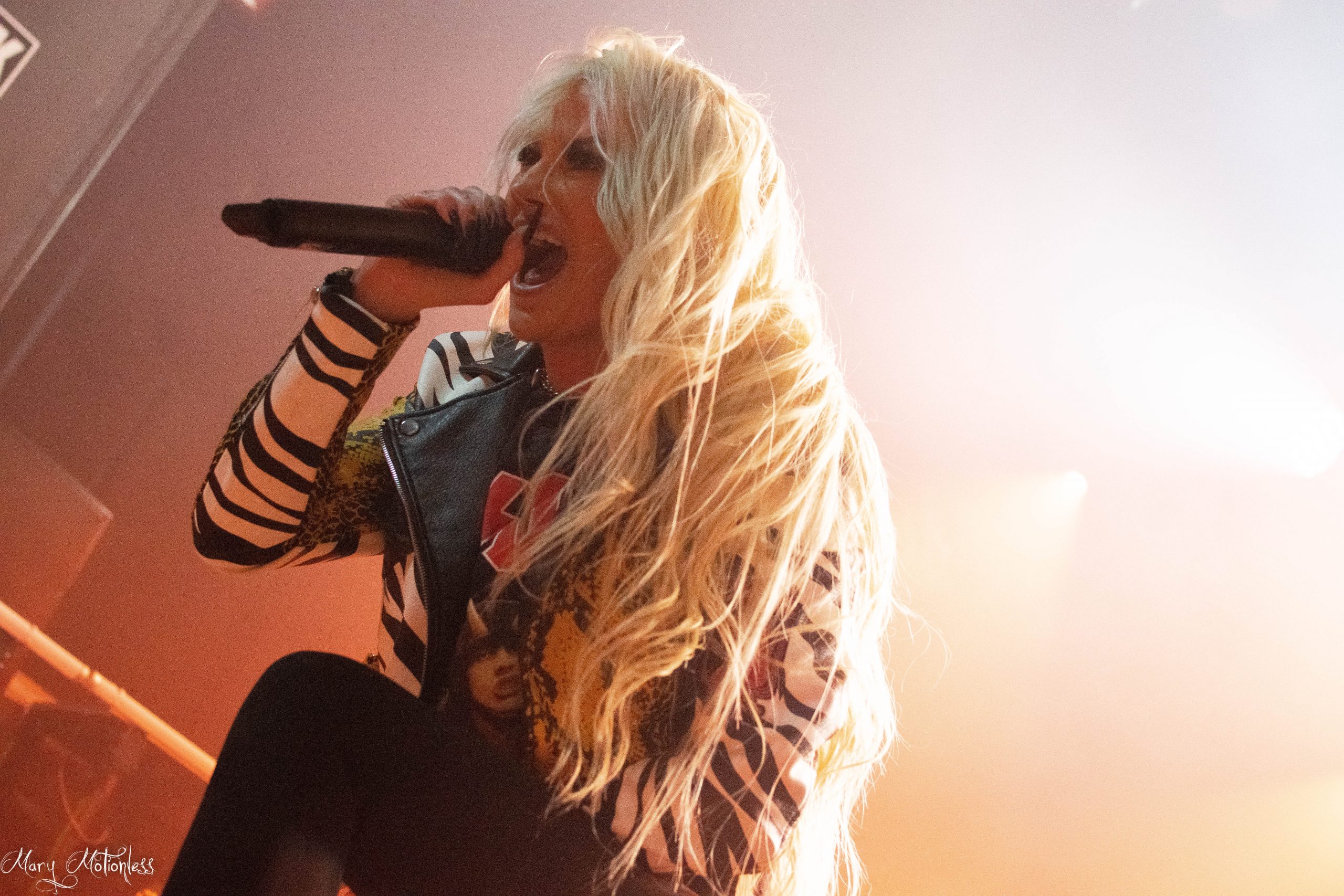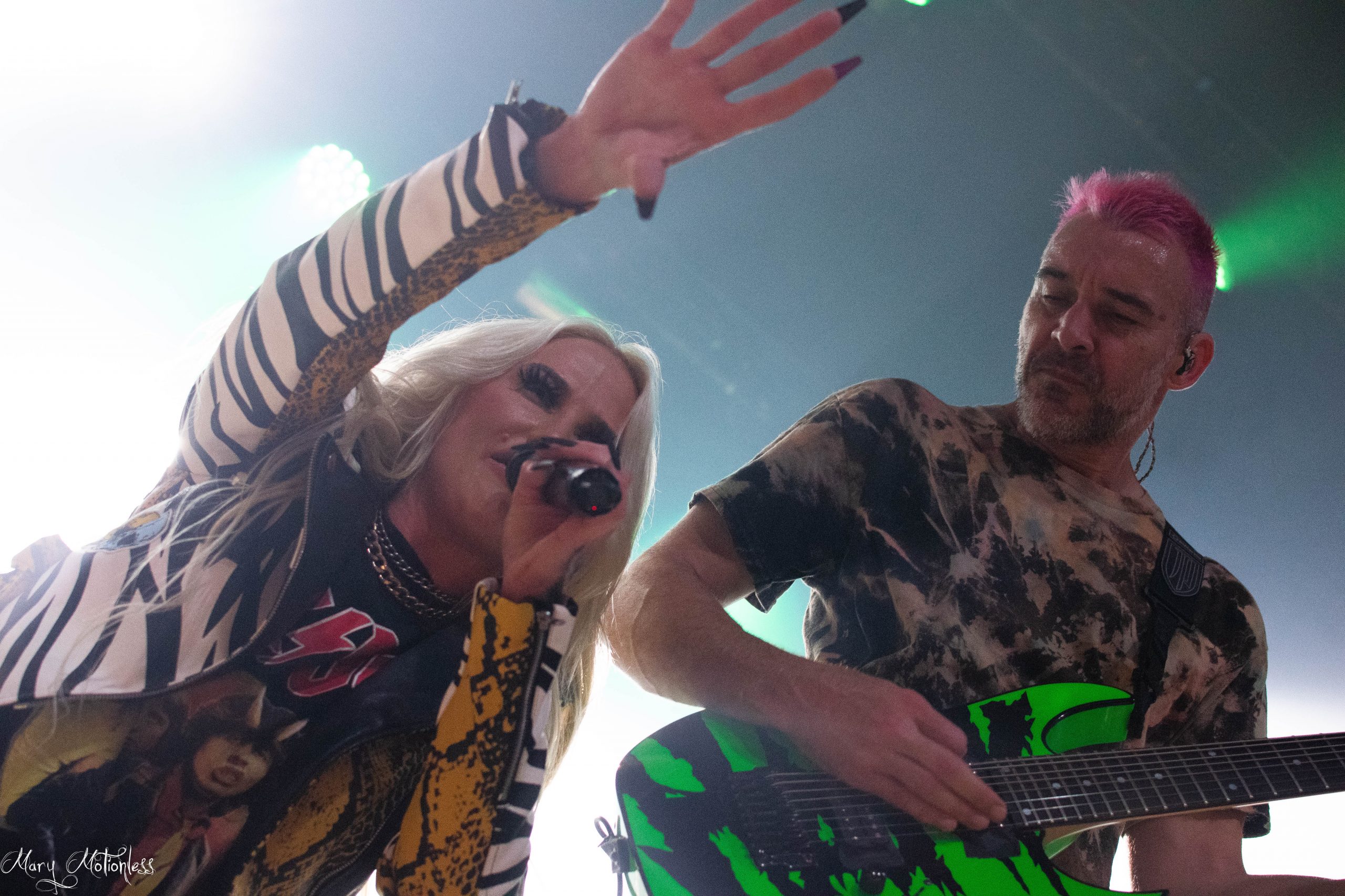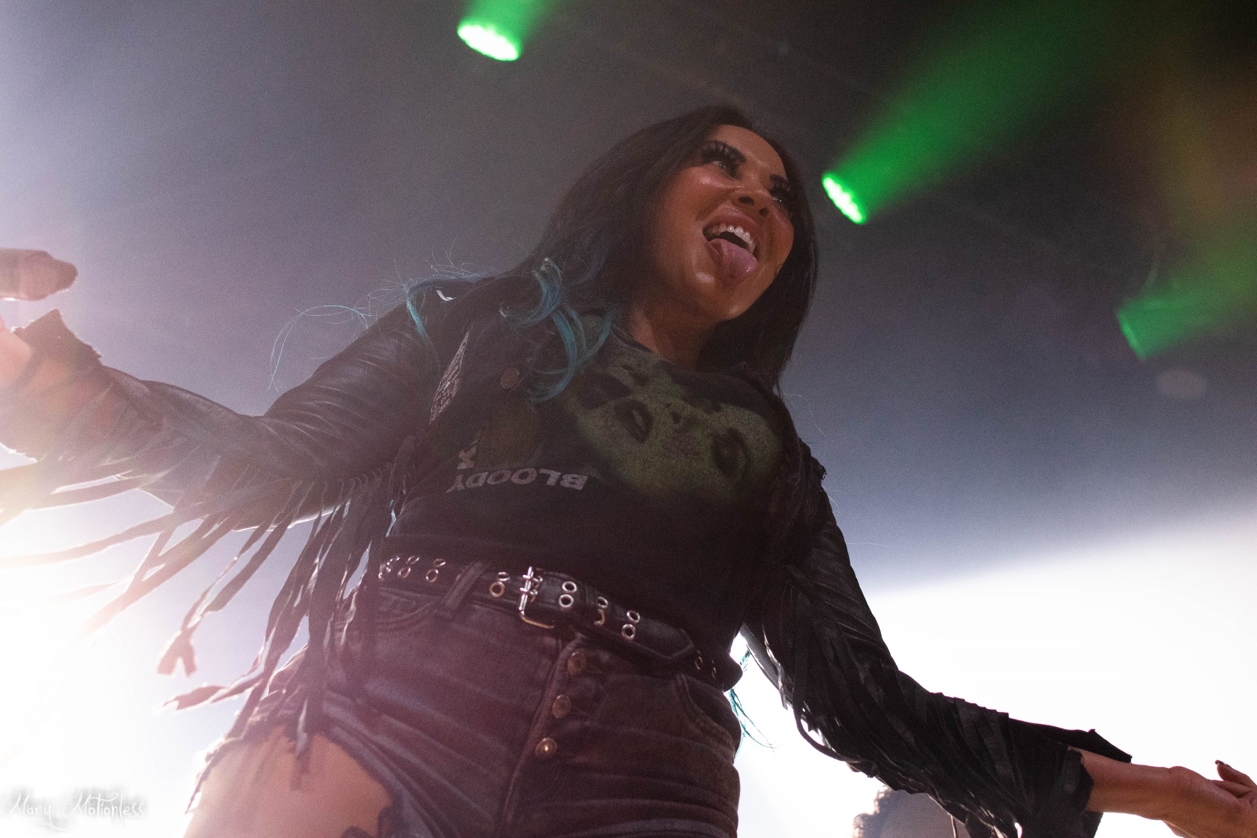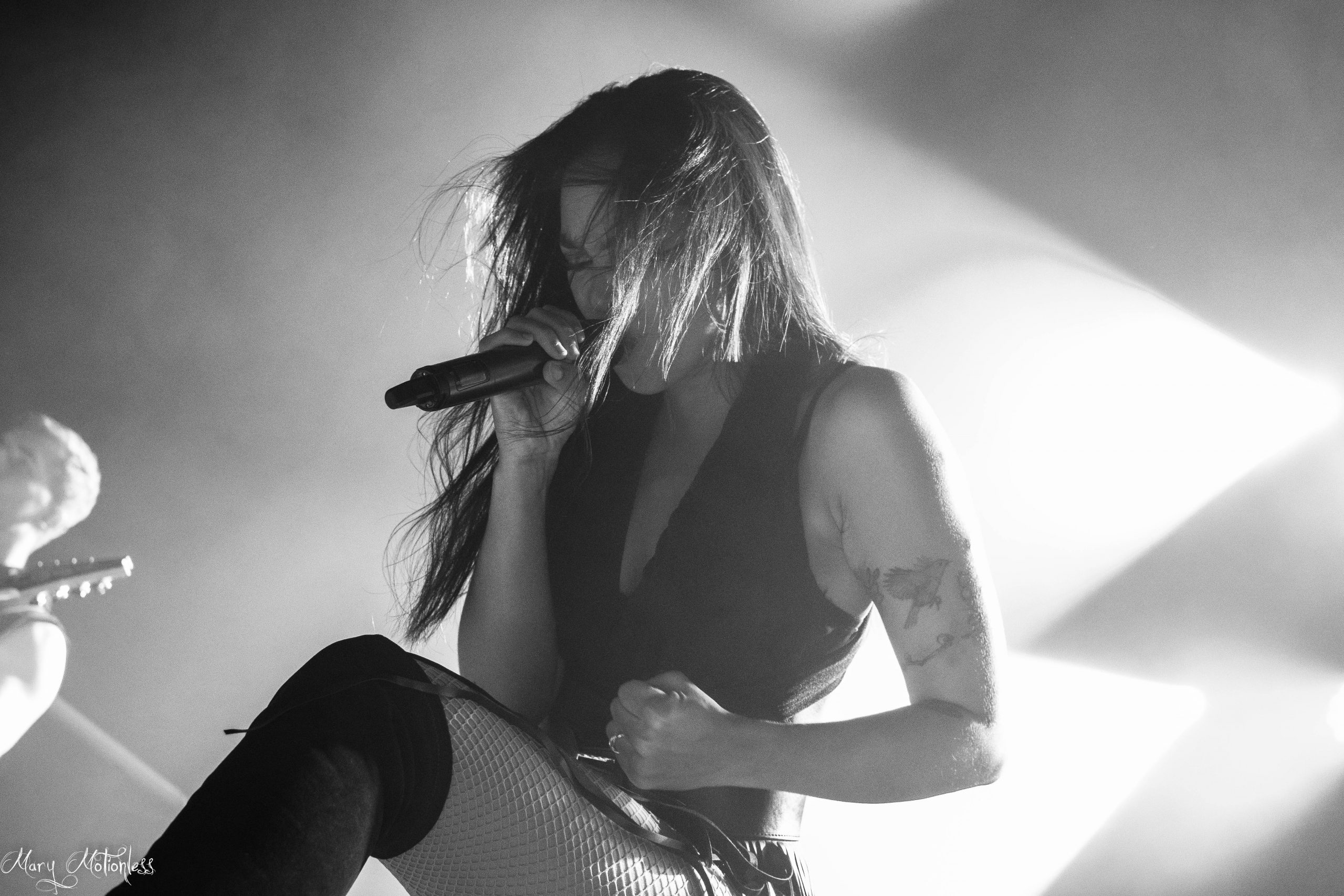 Le troisième groupe de la soirée est donc Beyond The Black. Les allemands arrivent sereins sur scène avec une décoration aux couleurs du groupe, tout comme leurs lumières qui offrent une immersion sans faille. La chanteuse ouvre d’ailleurs le bal avec Is There Anybody Out There en débarquant vêtue d’un costume noir et un long manteau noir mais surtout avec des néons qui en sont presque devenus indissociables. Jennifer Haben change même de tenue pour passer sur une robe rouge fendu sur la jambe puis exit la robe pour laisser place à un débardeur en dentelle noir et un short en simili, mais également un magnifique masque type esprit de forêt. Le public est très réceptif avec de nombreux nouveaux fans à leur actif. Ils ont créé la surprise en jouant deux titres (Reincarnation et Winter Is Coming) qui seront présents sur leur nouvel album éponyme qui sortira en janvier 2023 (Tiffany)