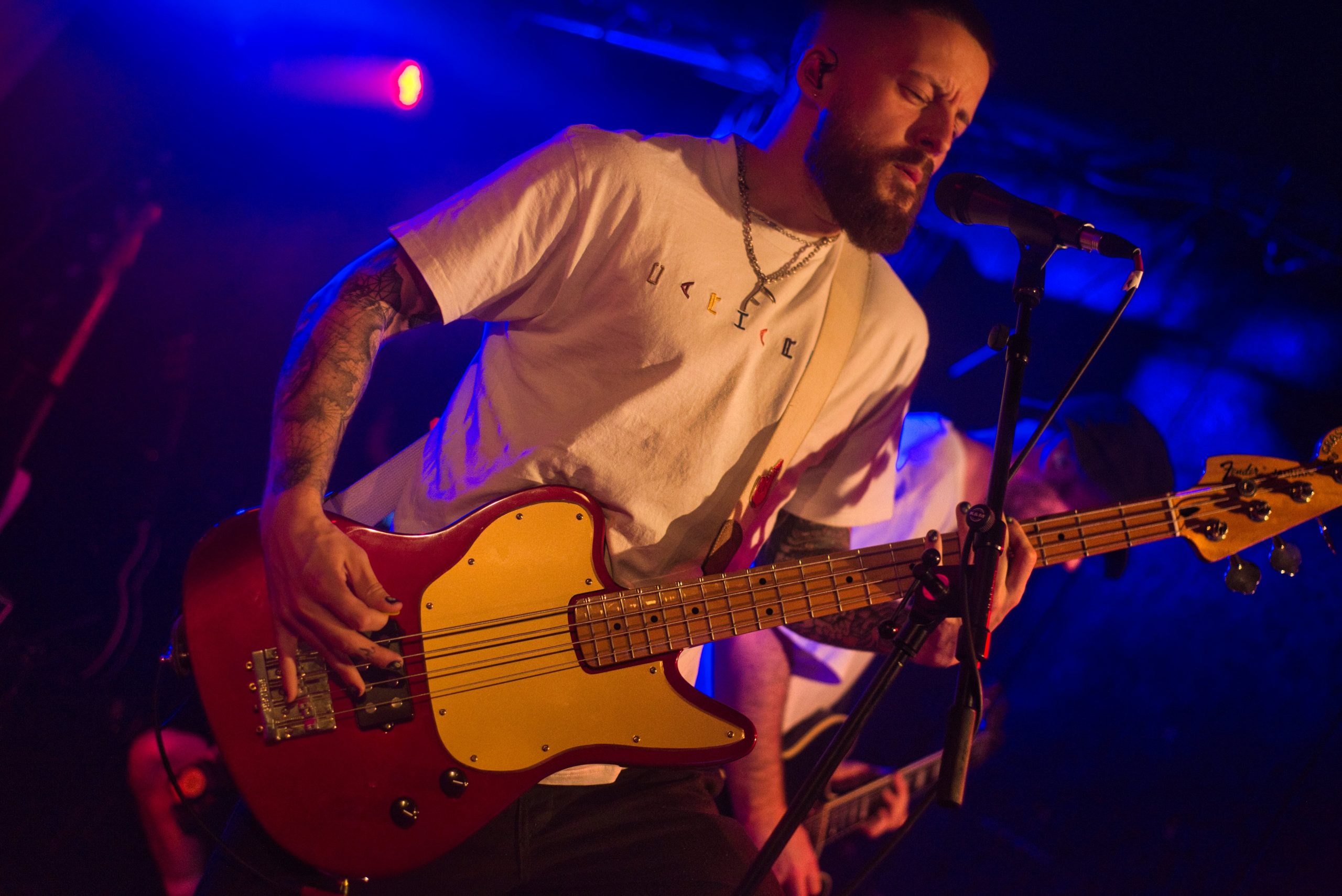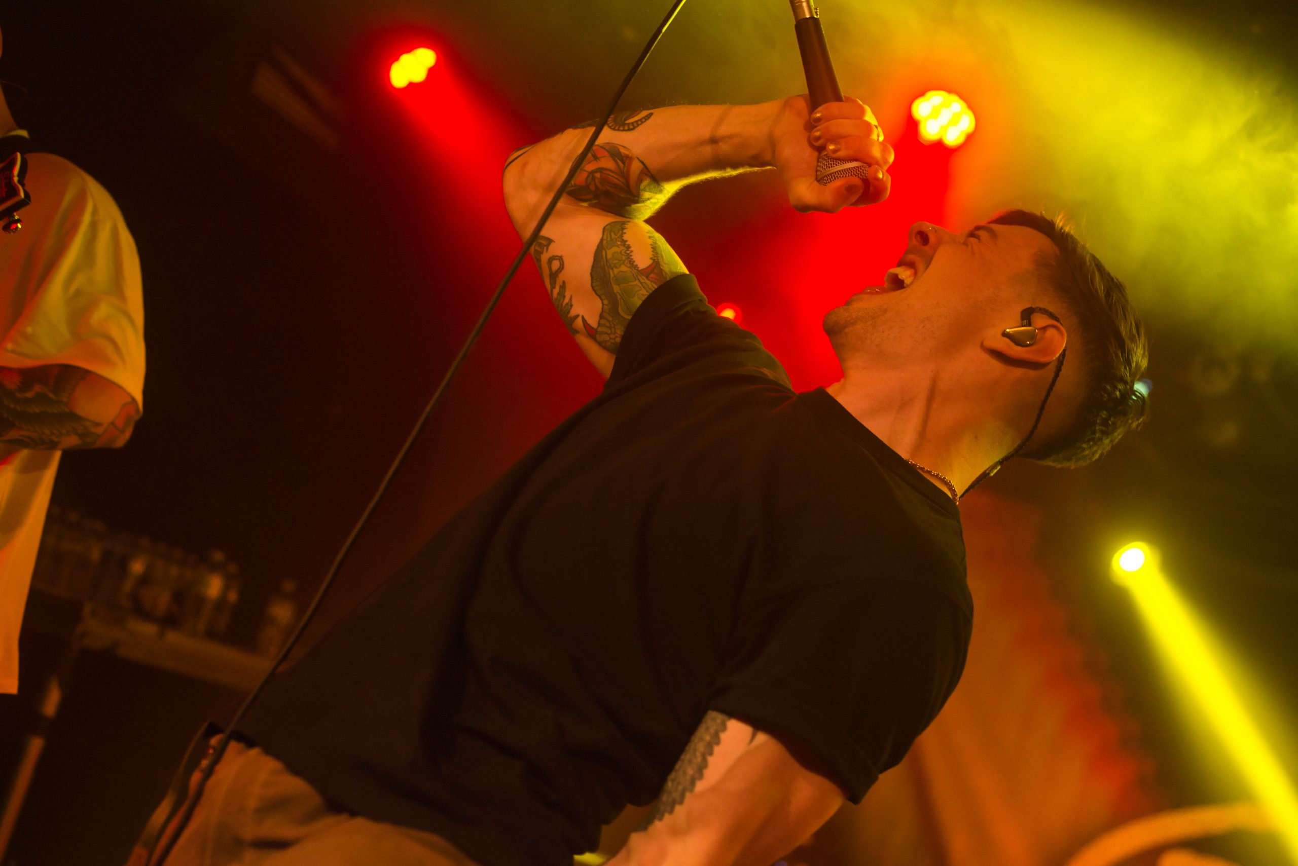 Entrent alors les capitaines de soirée. Paradoxalement, c’est sur la lancinante « Silence is Golden », que la tête d’affiche demande à l’audience d’élever sa voix. Le frontman en profite pour exprimer sa gratitude de voir la salle se remplir progressivement malgré l’absence de Creeper. « Cela fait 8 ans que nous sommes un groupe, et je sais ce que c’est que d’être dans l’audience, ce qu’on aimerait recevoir. Et ça, je veux vous le donner » déclare-t-il. Ainsi, nous sommes embarqués à travers leur dernier effort Don’t You Feel Amazing ? avec « Synthetic Sympathy », et leur titre « Bad Entertainment », dénonçant les médias et la désinformation. Ceux qui connaissent bien Trash Boat savent que c’est un groupe éminemment politique, et cela se ressent par des paroles toujours incisives, engagées, qui dénoncent une société bancale. Ils jettent des bouteilles à la mer, espérant que leurs messages puissent être reçus. Ainsi, Tobias ne manquera pas de faire un discours important sur les questions d’identité et de sexualité, en disant que lui-même ne souhaitait pas être mis dans une case, et qu’il ne fallait en aucun cas laisser quiconque nous laisser penser qu’il y a des règles dans le jeu de l’amour, car il n’y en a pas, et si vous pensez pouvoir contrôler quelqu’un, vous être un « idiot, you f*cking idiot » comme le déclare « Alpha Omega ».
