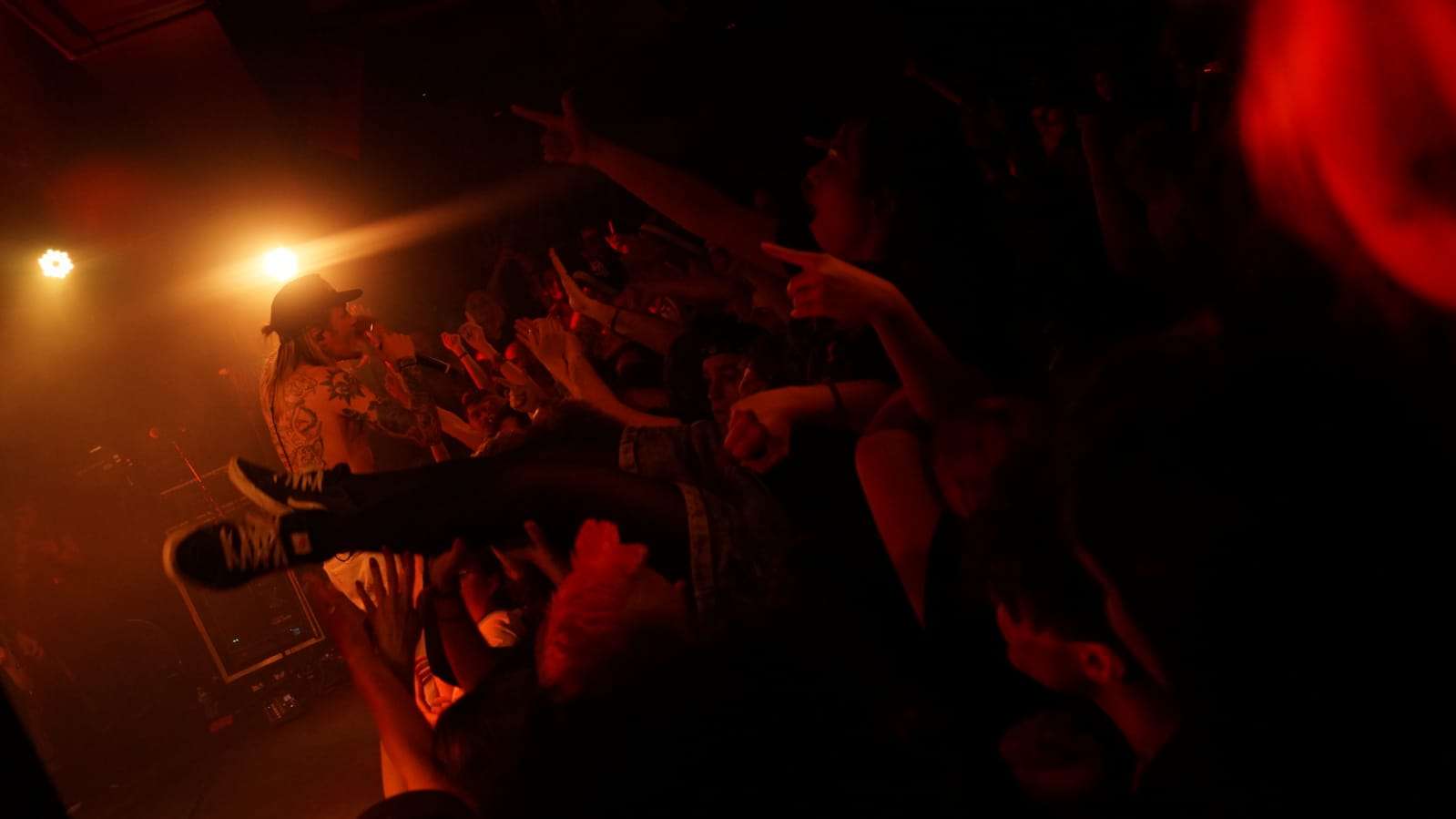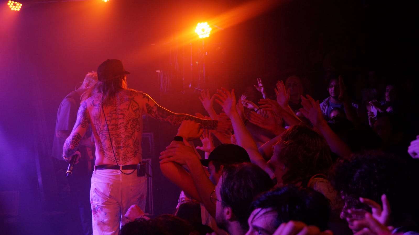 La salle ressemble à une soirée de campus américain dans un teen movie : des jeunes munis de bières, et une fosse pareille à une piscine qui saute dans tous les sens sur du Sum 41 ou Blink 182.