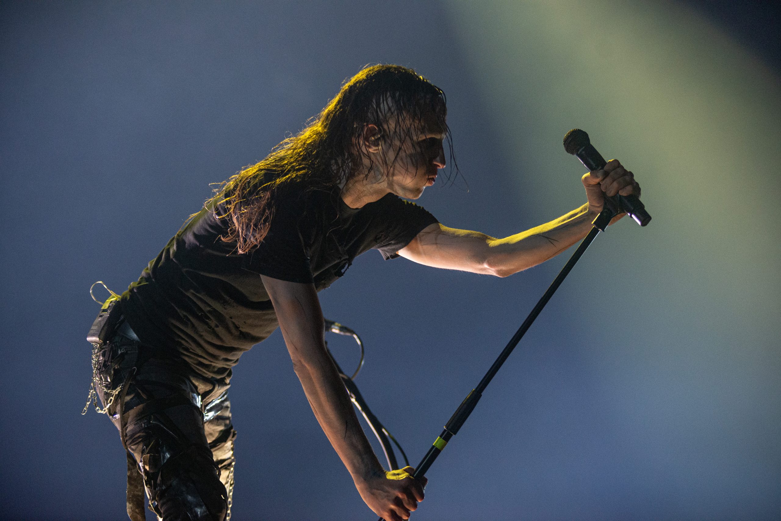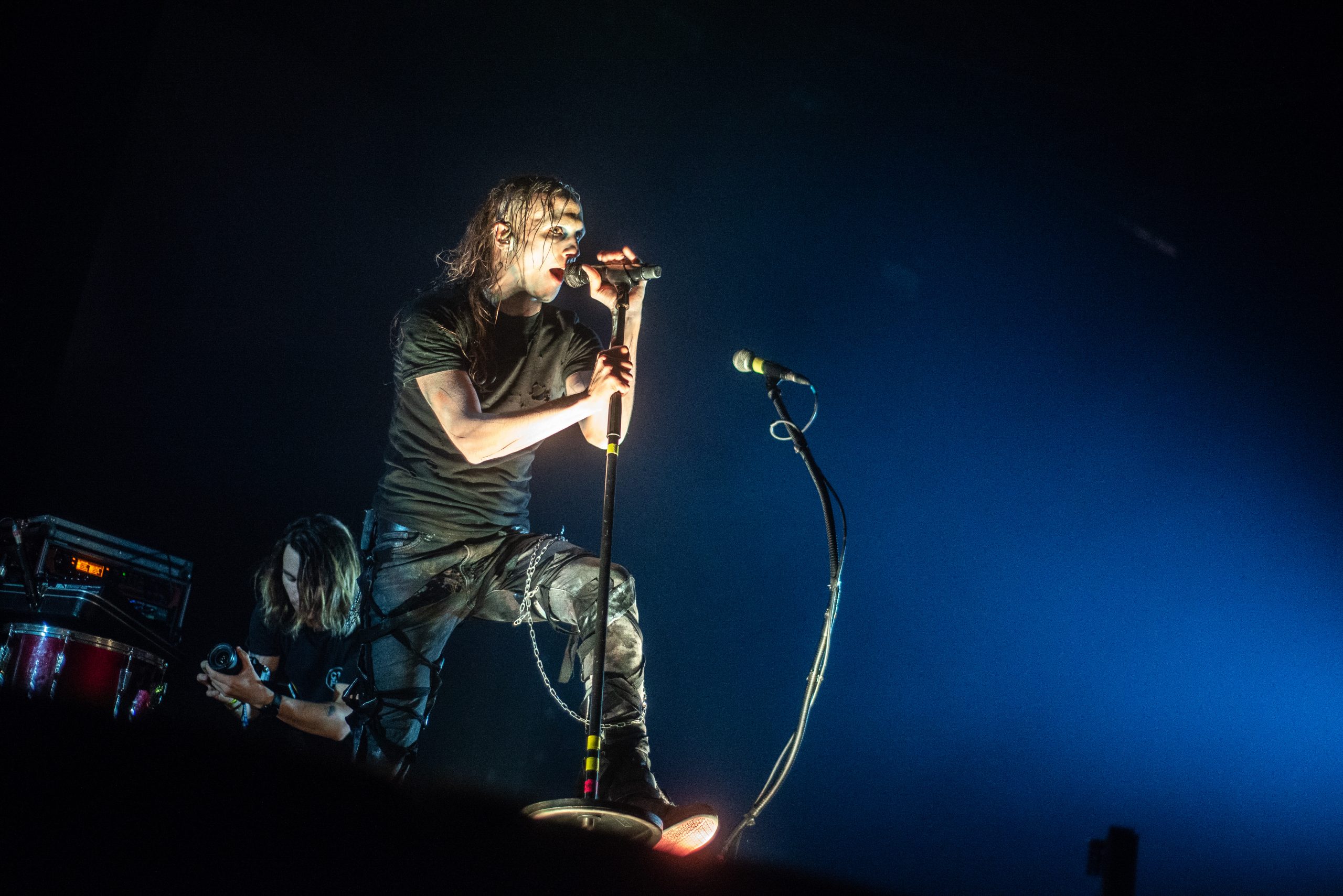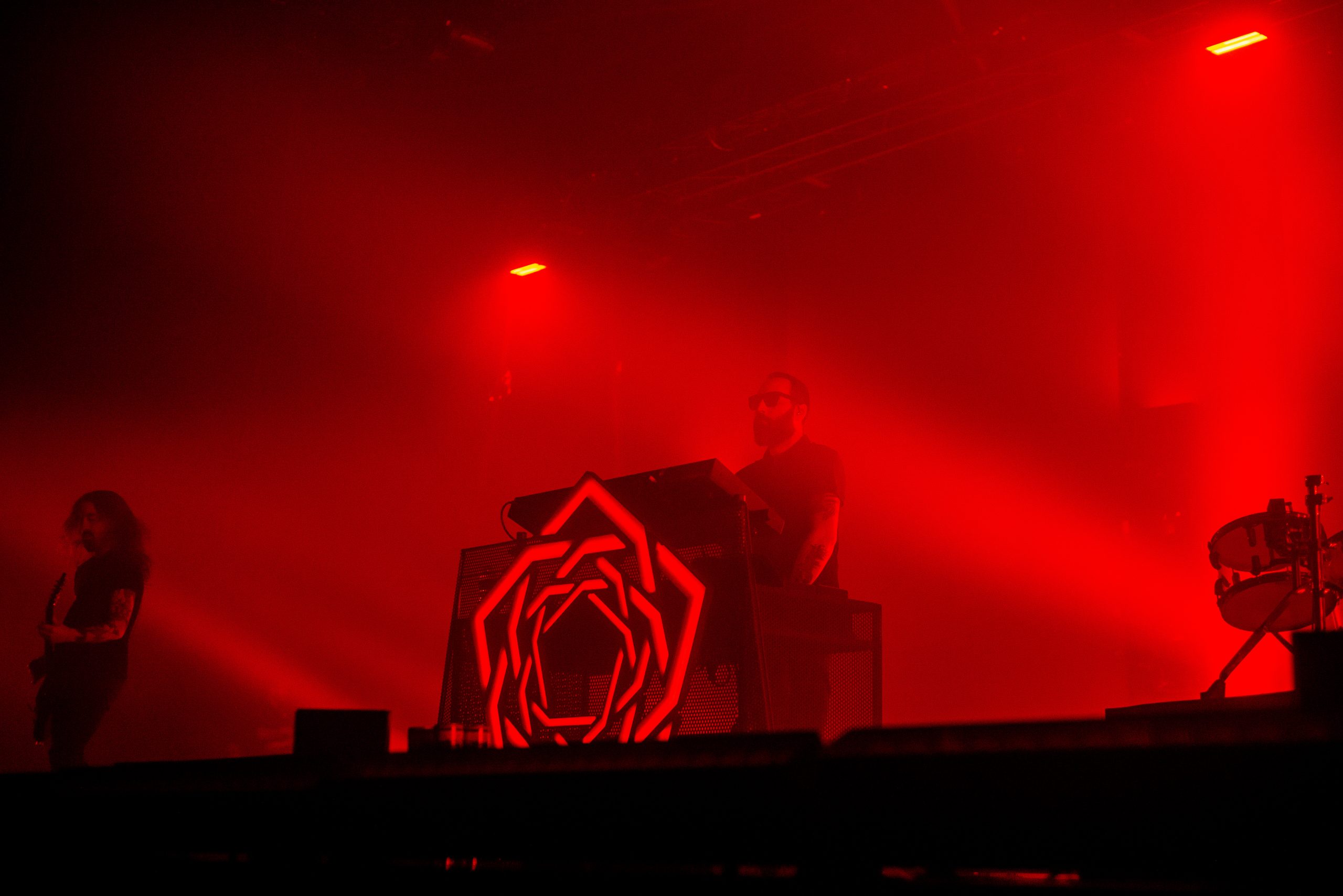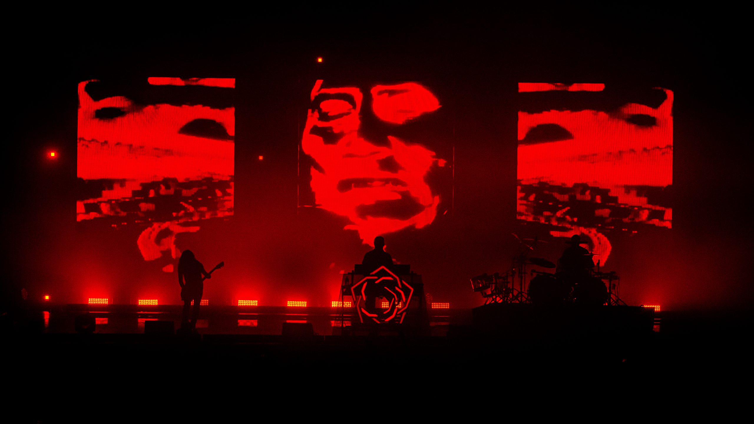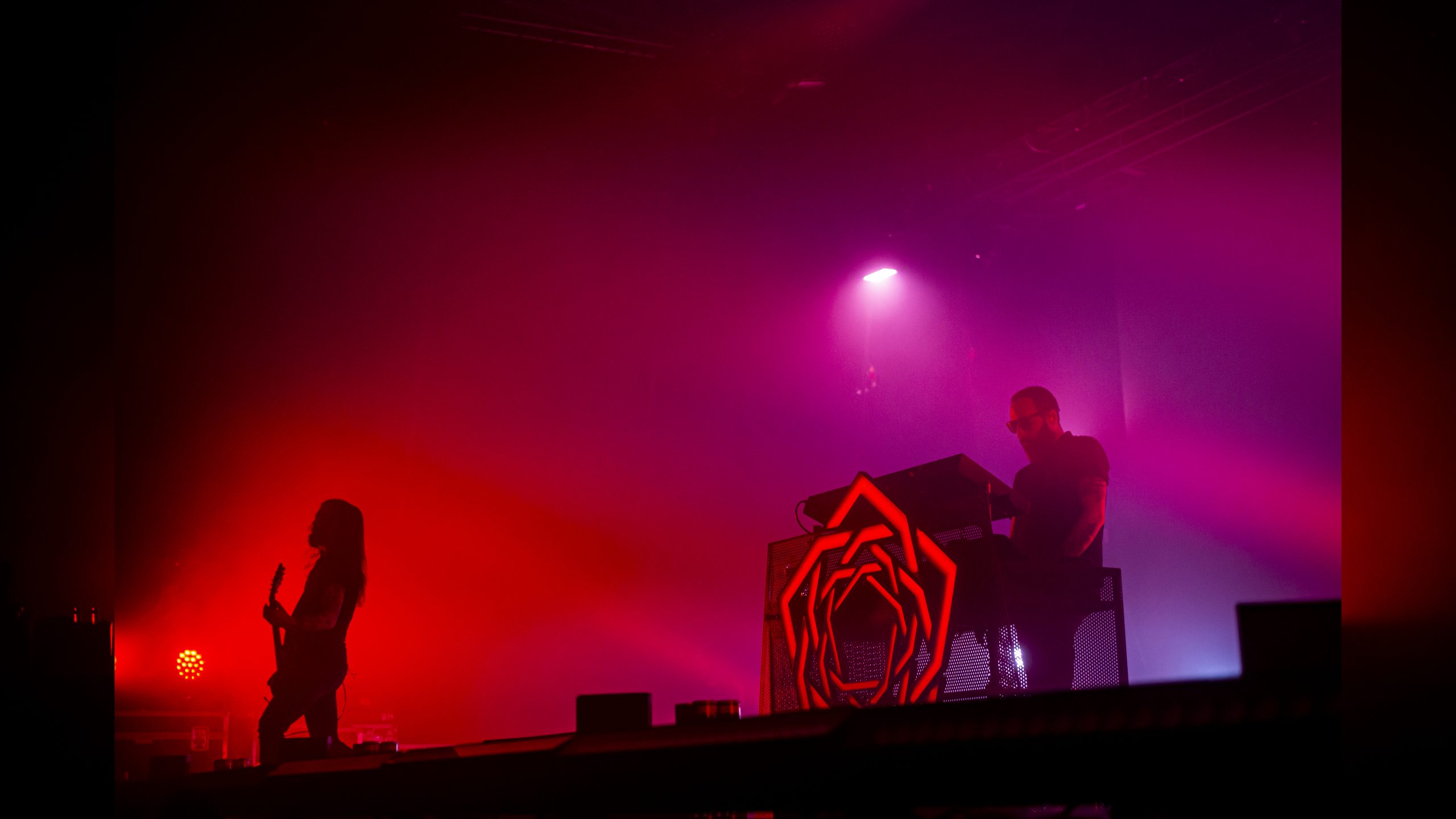 Sur l’air « Everybody » des Backsteet Boys, repris en chœur par le Zénith entier, nous comprenons qu’un paradoxe s’est opéré : nous sommes pareils. Nous avons cette part d’ombre que nous n’assumons qu’en étant tous ensemble. Alors nous nous aventurons dans l’obscurité vers l’endroit qui pourrait le plus satisfaire notre soif nouvelle de violence : le dancefloor. La chasse est ouverte avec « Opening Title ». Le projet Carpenter Brut est lancé, avec à sa tête Franck Hueso, et ses acolytes Adrien Grousset (guitariste du groupe Hacride) et Florent Marcadet (batteur de Klone et de Hacride). Ces chefs de file viennent directement des enfers (Straight Outta Hell), et vont mener notre armée nouvelle à dévoiler leurs pires facettes, qui risquent malheureusement d’être reflétées par l’énorme boule présente aux dessus des têtes. Il va y avoir des veuves et veufs, ce soir (The Widow Maker). L’entraînante « Roller Mobster » déchaîne la piste de danse, les corps se bousculent, se fracassent, on danse de façon presque rituelle. La guerre semblerait presque paradisiaque à côté (Paradise Warfare). D’ailleurs, les palmiers commencent à brûler sur les écrans géants. Le chaos est imminent, et alors qu’on ordonne aux victimes de courir (Run, Sally, Run), ces derniers semblent hypnotisés par les tubes ensorcelants joués par le trio. Ils se sont laissés avoir par cette poudre aux yeux, cette vraie mascarade (Lipstick Masquerade, interprétée sur scène par Persha). Le poison a fait effet, ils ne peuvent plus partir. Les rayons lumineux sillonnent la salle, la découpent. C’est déjà trop tard, et personne ne semble le voir. On se déhanche comme s’il n’y avait pas de lendemain et que c’était notre dernière chance. Vous ne croyez pas si bien dire. « Turbo Killer » est lancée, et le chanteur ordonne un wall of death. C’est un véritable assassinat. Il ne reste plus qu’à brûler les preuves et la scène de crime, dans les flammes de « The Perv ».