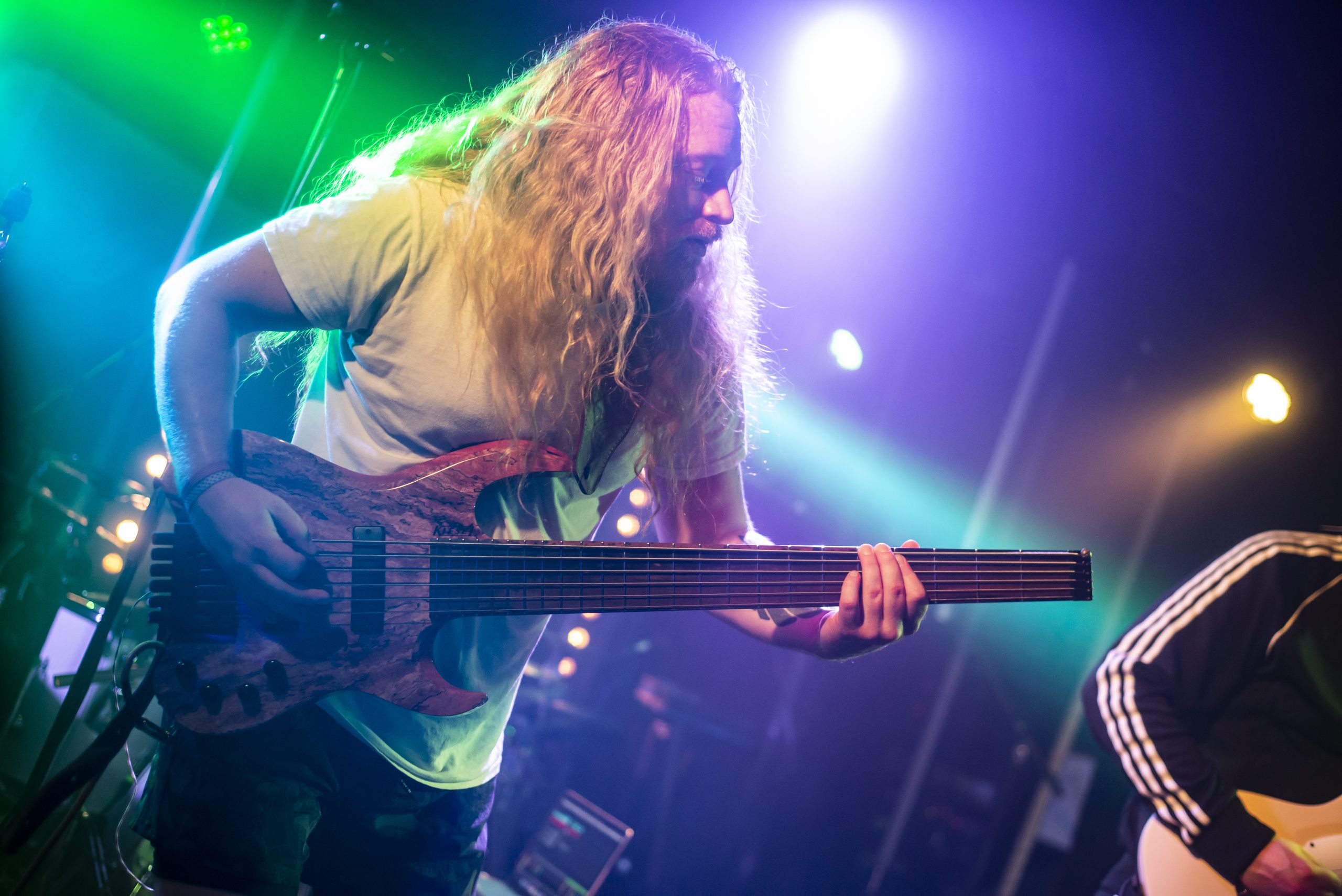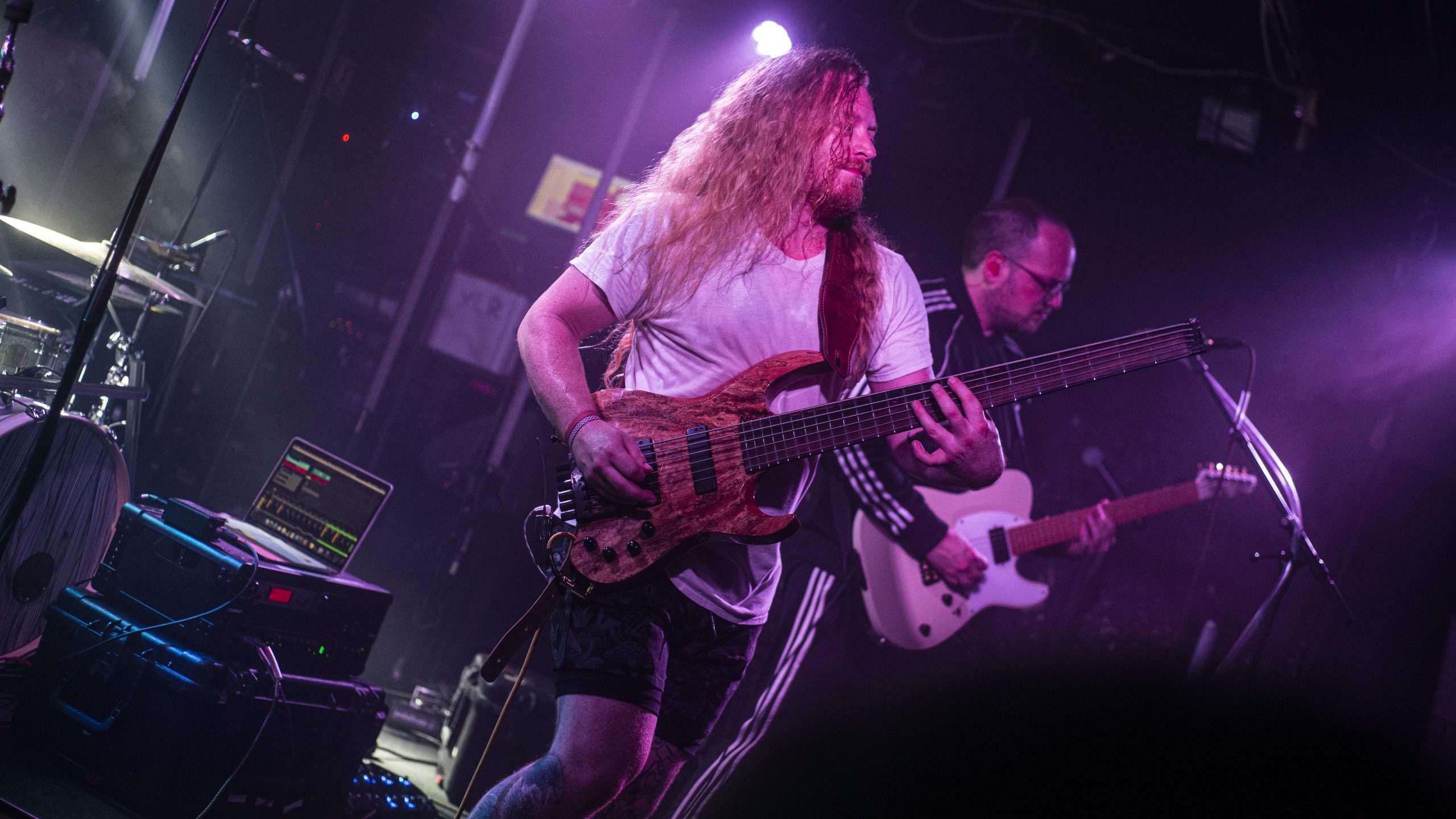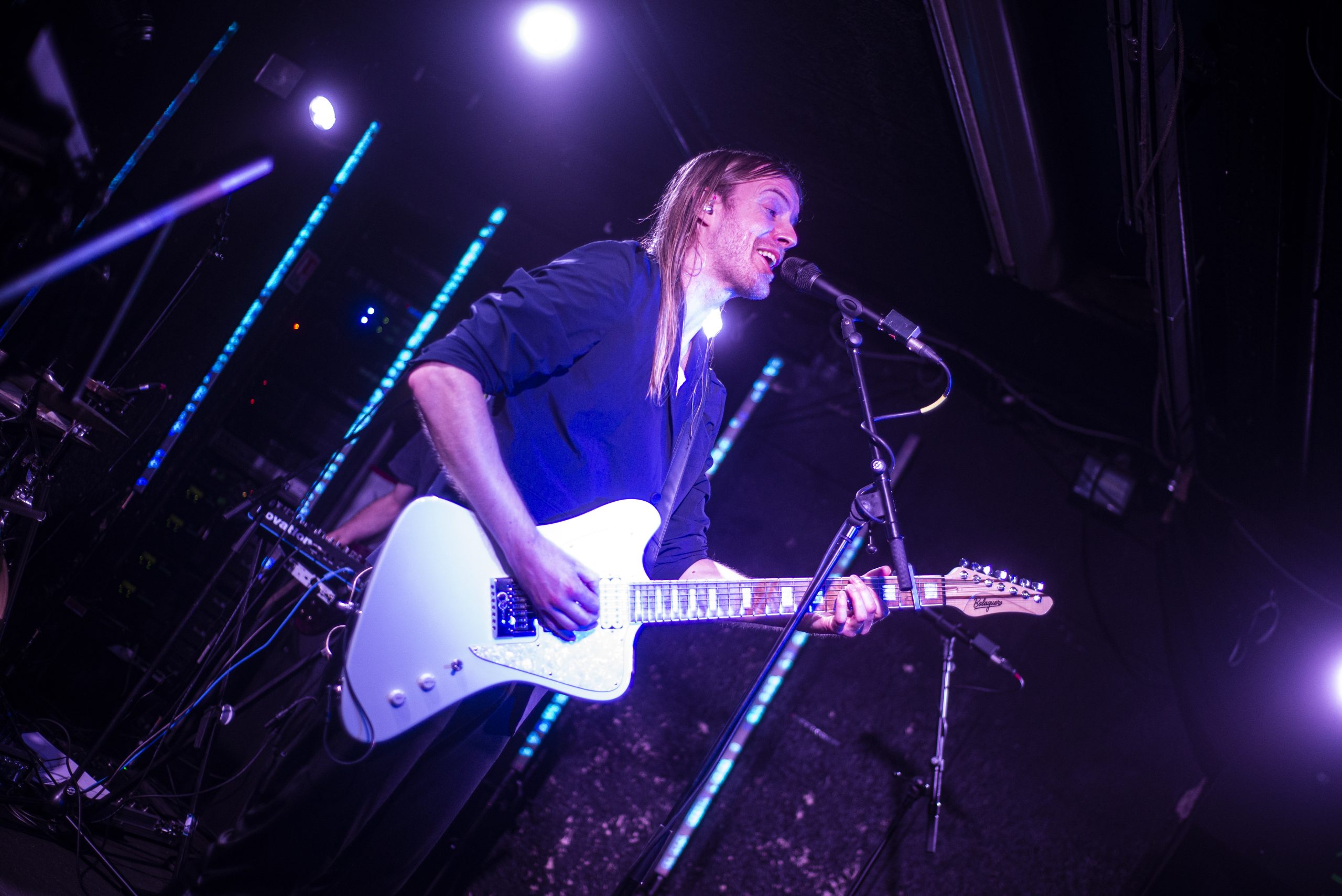Notre aventure débute avec la performance de Four Stroke Baron. Dès les premières notes, le trio nous téléporte dans un univers musical futuriste, parsemé de samples métalliques, robotiques, et du. synthé récurrent. Au rythme de Khera, Vacant Planet ou encore Friday Knight, les musiciens nous plongent dans une sorte de distopie, au sein de laquelle un ordre très particulier régit le monde. Les garçons exécutent leurs titres avec une précision et technicité incroyable, rien ne dépasse. L’instrumental nous dépeint un avenir complexe, flirtant avec le chaos d’une batterie martelée par Matt Vallarino, tandis que Kirk Witt, au chant quasi-prophétique instaure un ordre et une rigueur. Keegan Ferrari (basse), quant à lui, joue le rôle du personnage émancipateur : accompagné de sa basse puissante, le protagoniste danse sur scène comme s’il était seul, comme s’il était hors de cette dystopie. Il prend chacune envolée de note émanant de son propre instrument, ou de la guitare de son acolyte Kirk, pour s’échapper. Le bassiste ressemble à un enfant, qui n’est pas atteint par le malheur du monde, parce qu’il n’en est pas conscient. Et il faut dire que sa présence scénique est telle qu’il est difficile de ne pas le suite. Alors le public danse, et retrouve sa place d’humain, d’être de désir et de joie dans un monde qui pourrait sembler rigide tant la technique a pris de place. Technique qui, grâce au regard de Keegan, prend toute son humanité et sa chaleur. Nous rencontrons enfin le Cyborg, dans la ville (Cyborg, Pt.2 : the City), qui nous conduit vers notre capsule temporelle, espérant pouvoir nous ramener chez nous.
