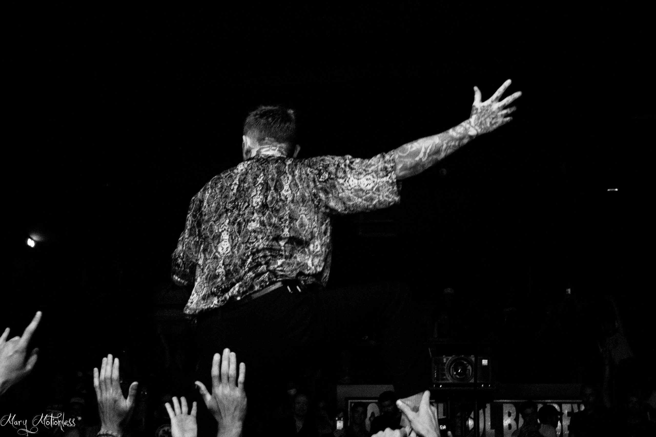 Et le moment tant attendu fini par arriver…Frank Carter & The Rattlesnakes débarquent sur scène! My Town met tout de suite dans l’ambiance et les pogos commencent pour ne jamais s’arrêter (et croyez-moi shooter en fosse avec un public aussi délirant ça manquait…PAS DU TOUT). Ce soir, la bonne majorité du dernier album en date du groupe sera jouée (dont notamment Sticky) mais l’accent sera mis aussi sur l’album End Of Suffering le tout entre deux blagues du chanteur, de signatures de sac et autres petites hontes à des membres du public, le set est littéralement excellent, et quand au bonheur de découvrir Juggernaut et Devil Inside Me en live en salle (Blossom meilleur album EVER). Comme à son habitude également, Frank Carter monte sur le public, fait le poirier mais ouvre aussi un pit pour les filles uniquement (et ça on va pas se le cacher c’est plutôt cool) même si bien sûr dès les premières notes certains troublent la fête qui font interrompre le début de ce pit fabuleux. . Frank est aussi armé ce soir d’un appareil photo (ou de son téléphone avec lequel il se filme avec ses musiciens) avec lequel il s’amuse plutôt bien, la preuve en image :