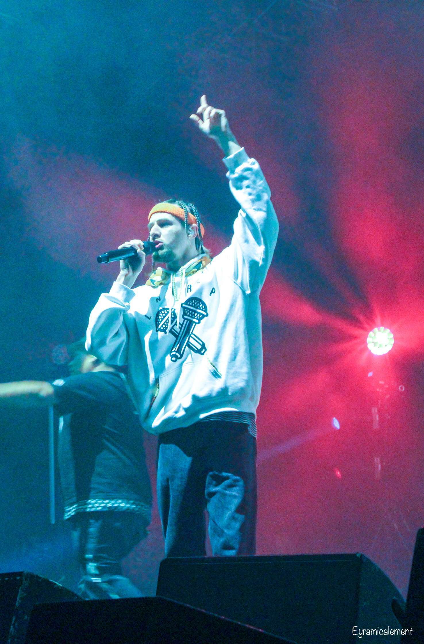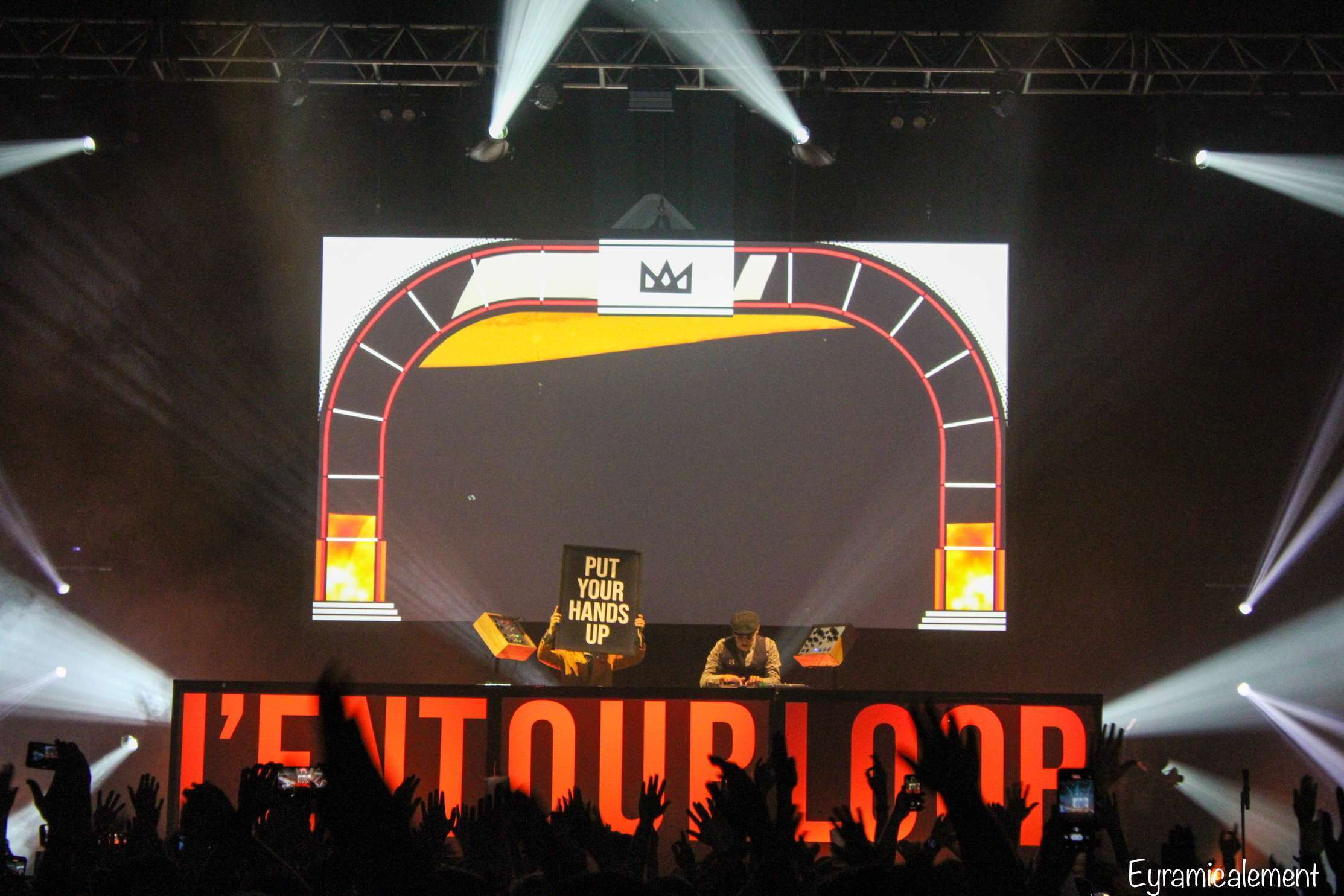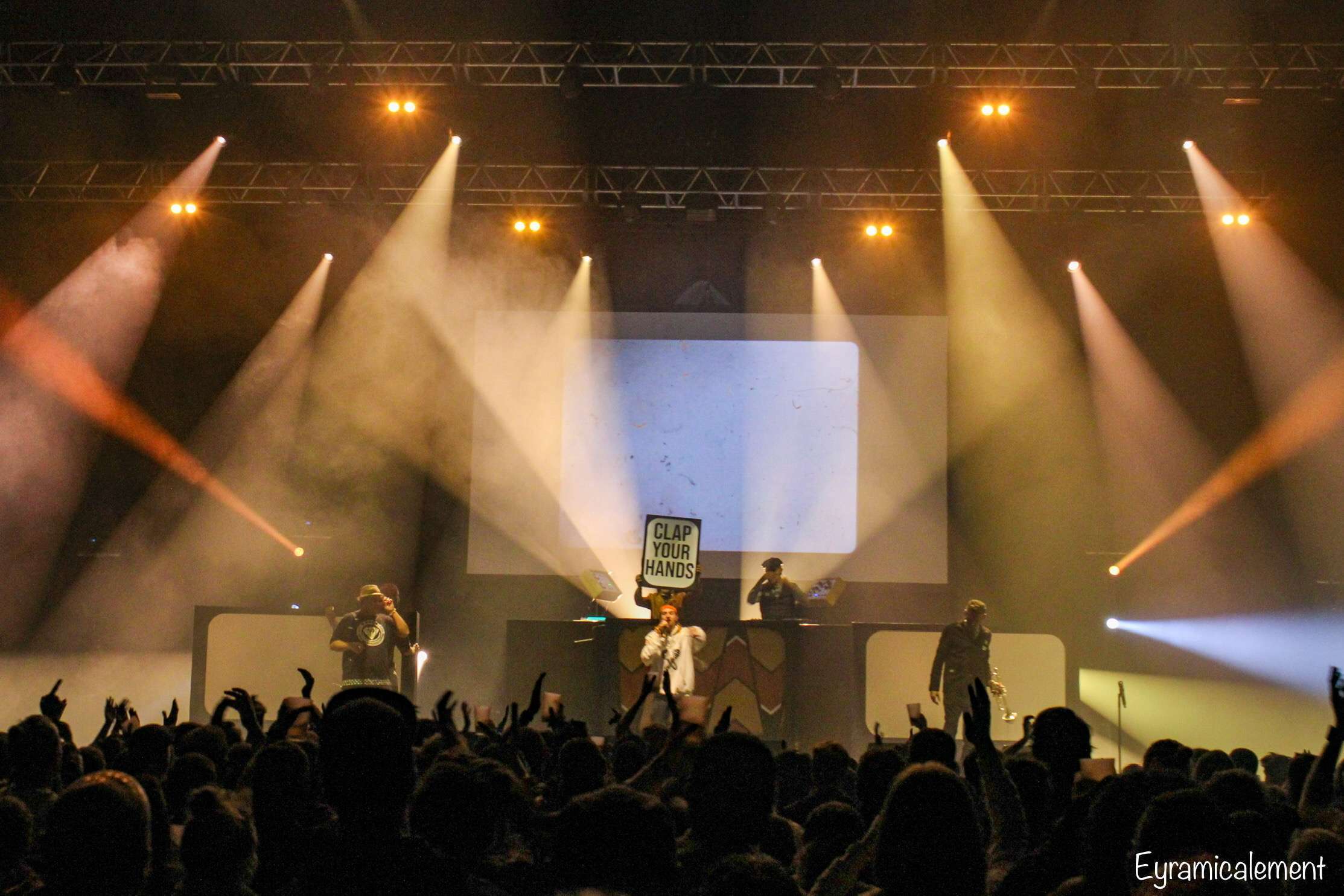 20h sonne et la fosse du zénith est quasiment rempli ce soir pour accueillir le premier groupe de la soirée. Durant une heure, L’entourloop vont nous présenter une retrospective rapide de leur carrière et bien évidemment nous présenter leur dernier album La Clarté Dans La Confusion. Le duo est accompagné par MC Troy Berkley, Blabbermouf et du trompettiste N’Zeng qui apporte une réelle énergie. Scénographiquement, ils vont tout faire pour faire danser le public. Avec leurs grandes pancartes « Clap Your Hands », « Put Your Hands Up » qu’ils lèvent sur certains morceaux, ou leurs écrans qui bougent dans tous les sens, L’entourloop ne se résume pas qu’à de la musique ce soir. Ils font monter la température et l’ambiance avec un monstrueux compteur d’ambiance sur le contour de scène. On aura le droit notamment à un enchainement dansant avec « Ruffian Rugged », « Blackout Ja », « Lyricson », « Queen Omega » et « Bounty Killa » pour faire décoller ce compteur.