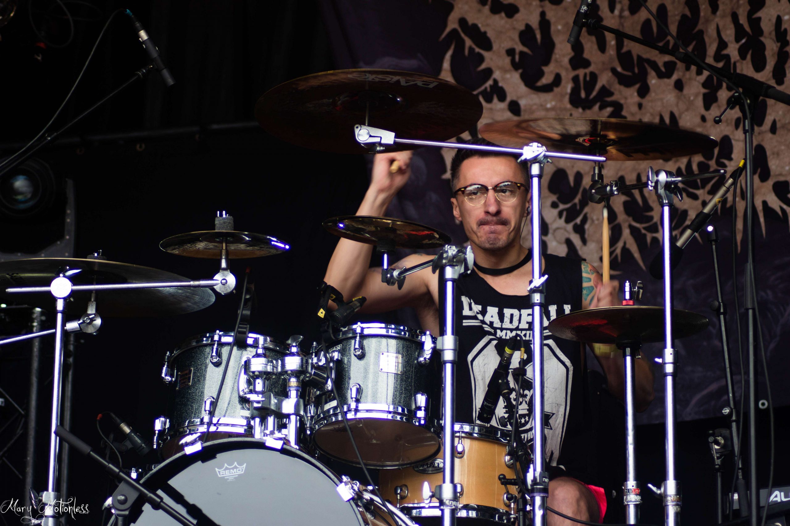 Pour le concert suivant retour à la Mustage pour ce qui sera un des concerts marquants de cette deuxième journée, Hypocrisy!. Premier indice de ce que va être le show, la batterie est montée sur ce une pyramide dont elle est le sommet. Et dès l’entrée des musiciens sur scène nos yeux et nos oreilles vont être comblés.