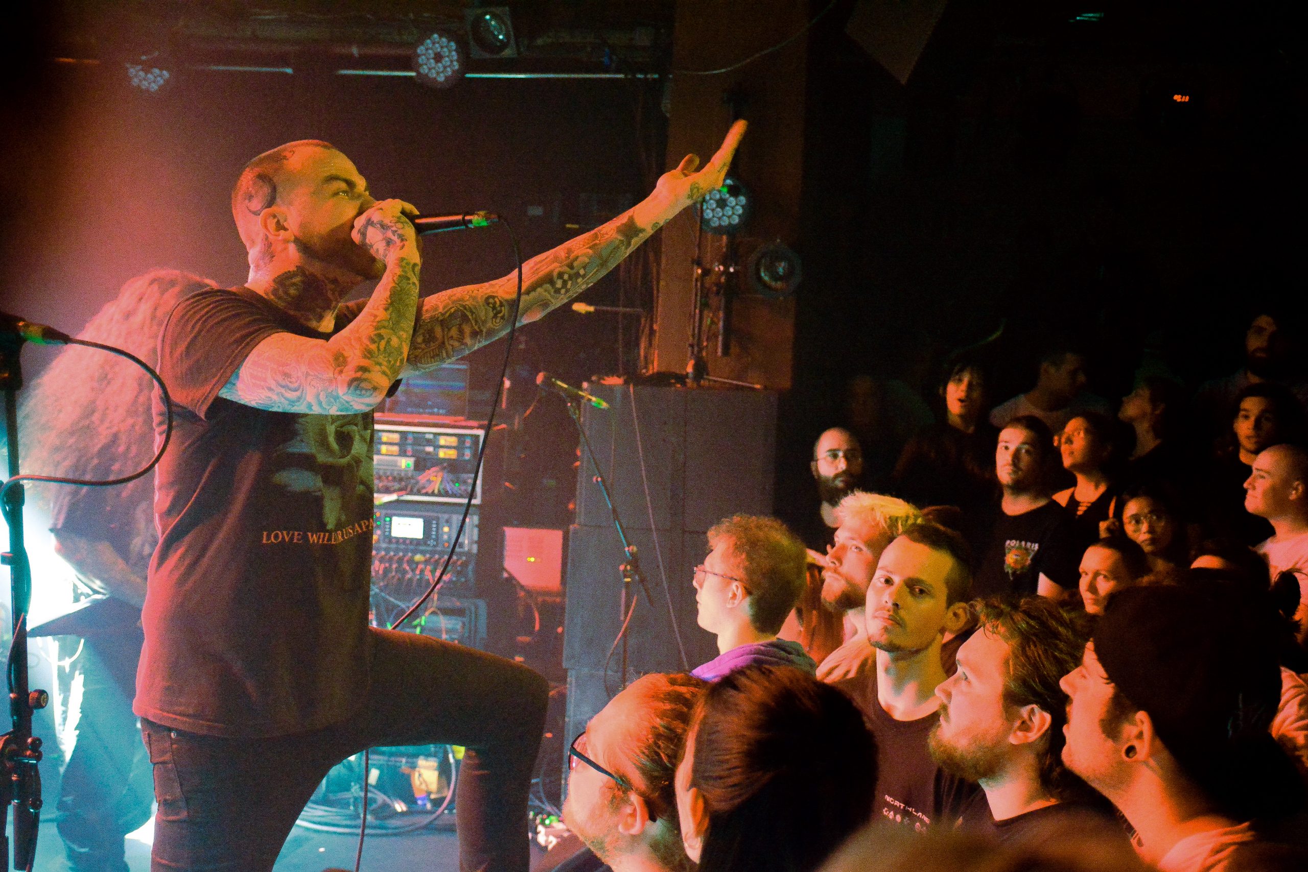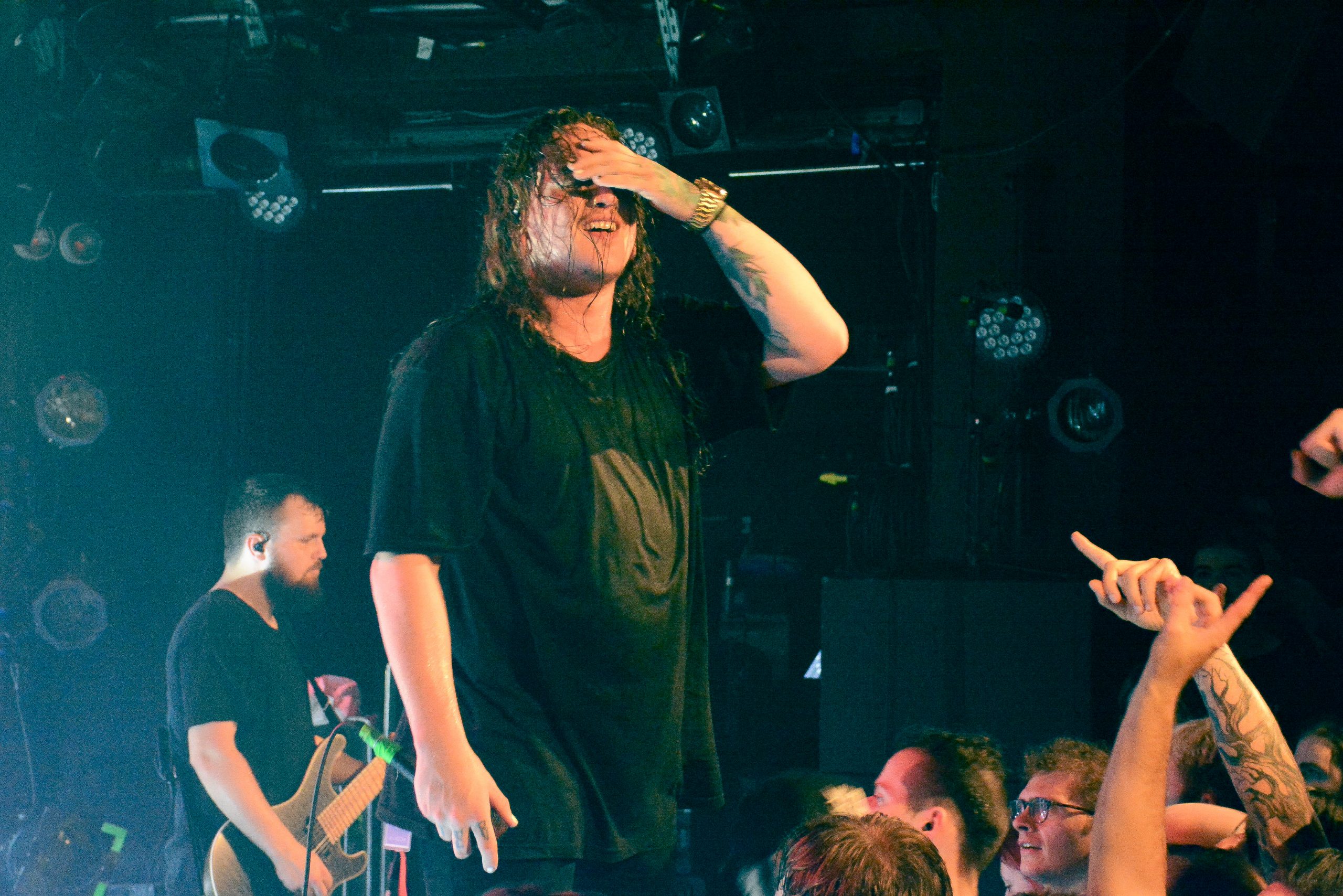 Les doyens de la soirée se prononcent à leur tour. Polaris, dans leur grande sagesse, décident d’alléger l’ambiance avec des propos plus délicats. Avec Pray for Rain, les musiciens exposent le menu d’une soirée plus douce, nappée d’une douceur réconciliante. Avec leur technicité, les garçons nous cuisinent une setlist aux petits oignons, axée autour de leur dernière spécialité, The Death of Me, avec des notes de The Mortal Coil. La polarité de la soirée à changée. Nous savourons chaque note de leur setlist aux saveurs de paix, leurs morceaux sont une sorte d’umami auditif : complexes, mais réconfortants et familiers, qui donnent envie de plus. Chaque morceau est parfaitement exécuté, finement découpé, et généreusement partagé. Ce sont des chefs, dans une salle étoilée par des milliers de petites lumières parsemant les murs. Ce soir, leur musique est littéralement une nourriture pour l’âme. Instrumentalement intelligente, avec des paroles nourrissante, qui font du bien. C’est un nutriscore A+ pour les oreilles. La merveilleuse « Above My Head » retentit et emporte la salle dans leur univers à la limite de l’onirique. L’audience leur rend cette énergie apportée en clamant les paroles, en dansant au rythme de leurs préparations. C’est un moment de partage intense, que le groupe semble apprécier autant qu’eux. Ils déposent sur leurs morceaux des sourires, et forment des cœurs avec leurs mains. Nous sommes loin du chaos précédemment vécu. Tout ici semble tiré à quatre épingles, et si le pit se déchaîne, l’énergie qui s’en dégage est extrêmement positive. Nous consommons leur set à une vitesse folle, nous vagabondons au rythme de leurs œuvres, si bien que nous arrivons déjà au dessert avec la tant attendue « Masochist », surmontée de « Lucid », à la manière d’une pièce montée. C’est l’apothéose de la soirée. Les australiens nous proposent merveilleuse « Martyr (Waves) », champagne de la soirée, suivie de The Remedy en guise de digestif, avant de nous dire au revoir, réconciliés, unis par une même passion.