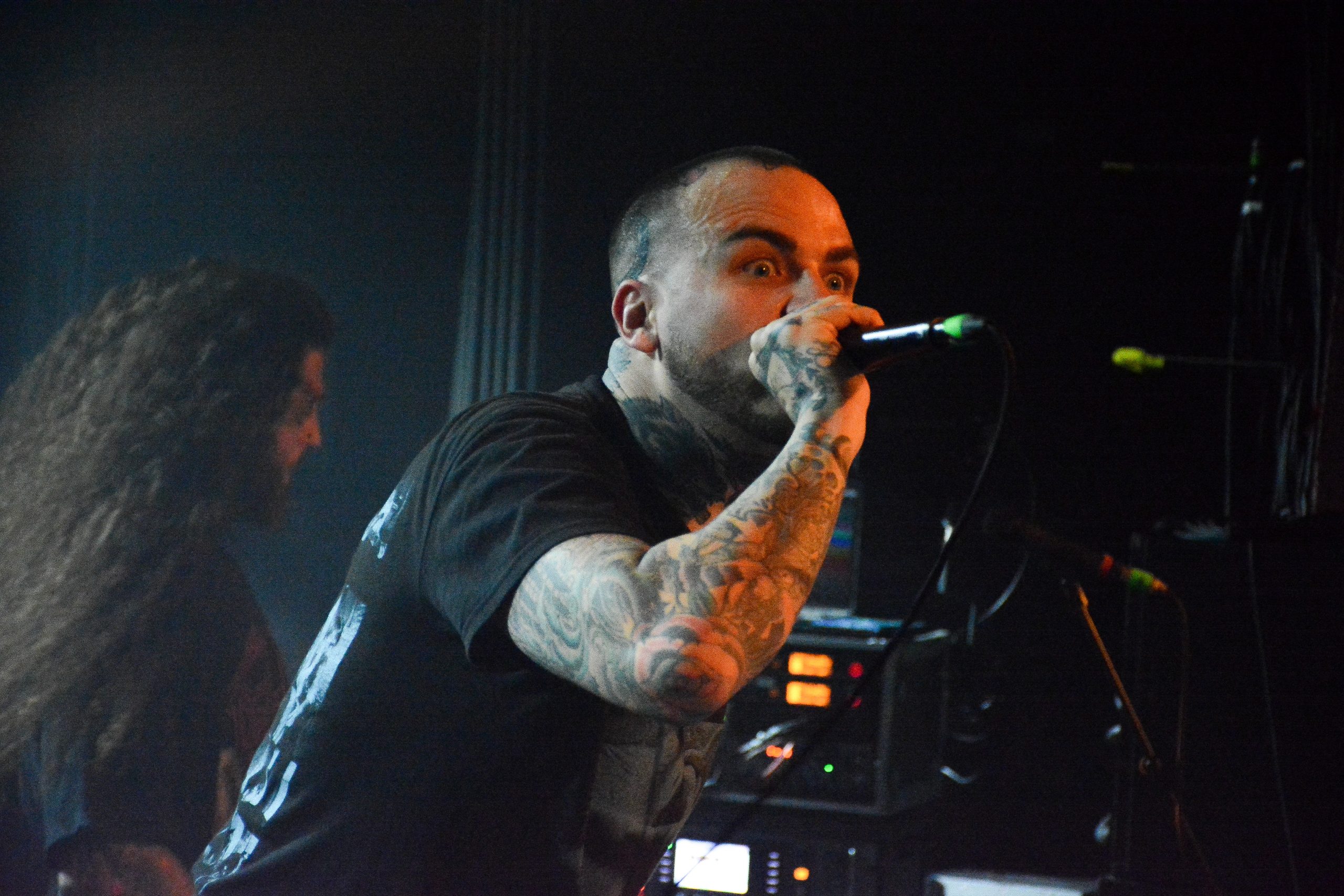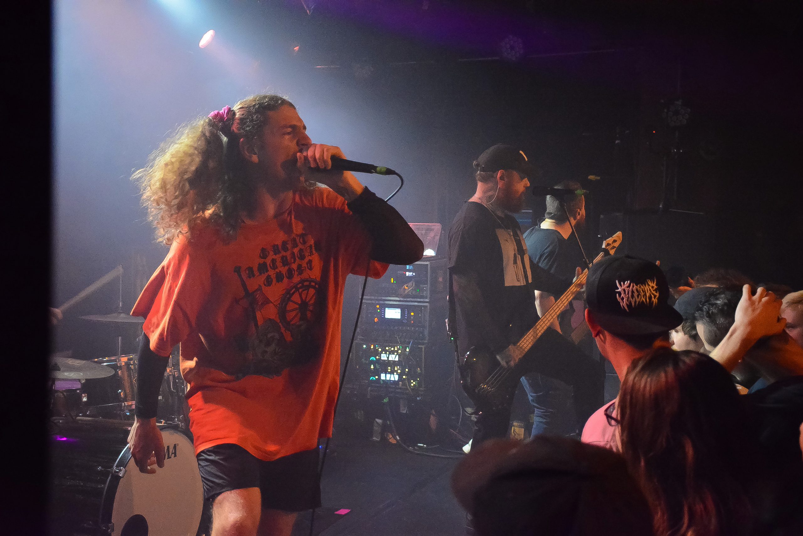 Les enfants partis se coucher, Great American Ghost se mettent à table avec les sujets graves qu’ils  aiment tant évoquer. En effet, ils nous rappellent qu’y a des sujets plus graves et plus urgents dans notre société, qui mériteraient d’être discutés plutôt que de nous taper dessus. Ensemble, nous pourrions plutôt réfléchir à ces thèmes plus importants que nos petits différends, car notre société va mal. Ils entament la discussion en citant leur dernière lecture, Torture World, en intégralité. Ils ne manquent pas de faire référence à Power Through Terror, incontournable lors d’une discussion avec eux. Malgré la violence de leurs propos, et leur dureté, tout le monde semble les écouter avec intérêt. On peut même le dire, ils mettent tout le monde d’accord. A mesure que les garçons exposent leurs idées, l’audience les suit, s’insurge avec eux, se mobilisent dans la fosse, et s’agglutinent pour mieux entendre leurs propos. Les garçons dénoncent avec intelligence les disparités, les inégalités de ce monde. L’ambiance et lourde, bien que passionnante. Le groupe offre un moment de qualité à son audience. Leur propos est organisé, propre, lucide, éclairé, on sent qu’ils ont de l’expérience. Ils ne prennent pas de pincettes pour dire ce qu’ils ont à dire. Malgré la forme violente des propos, leur auditoire semble ressortir de ce speech en étant apaisée, sereine, et revigorée.