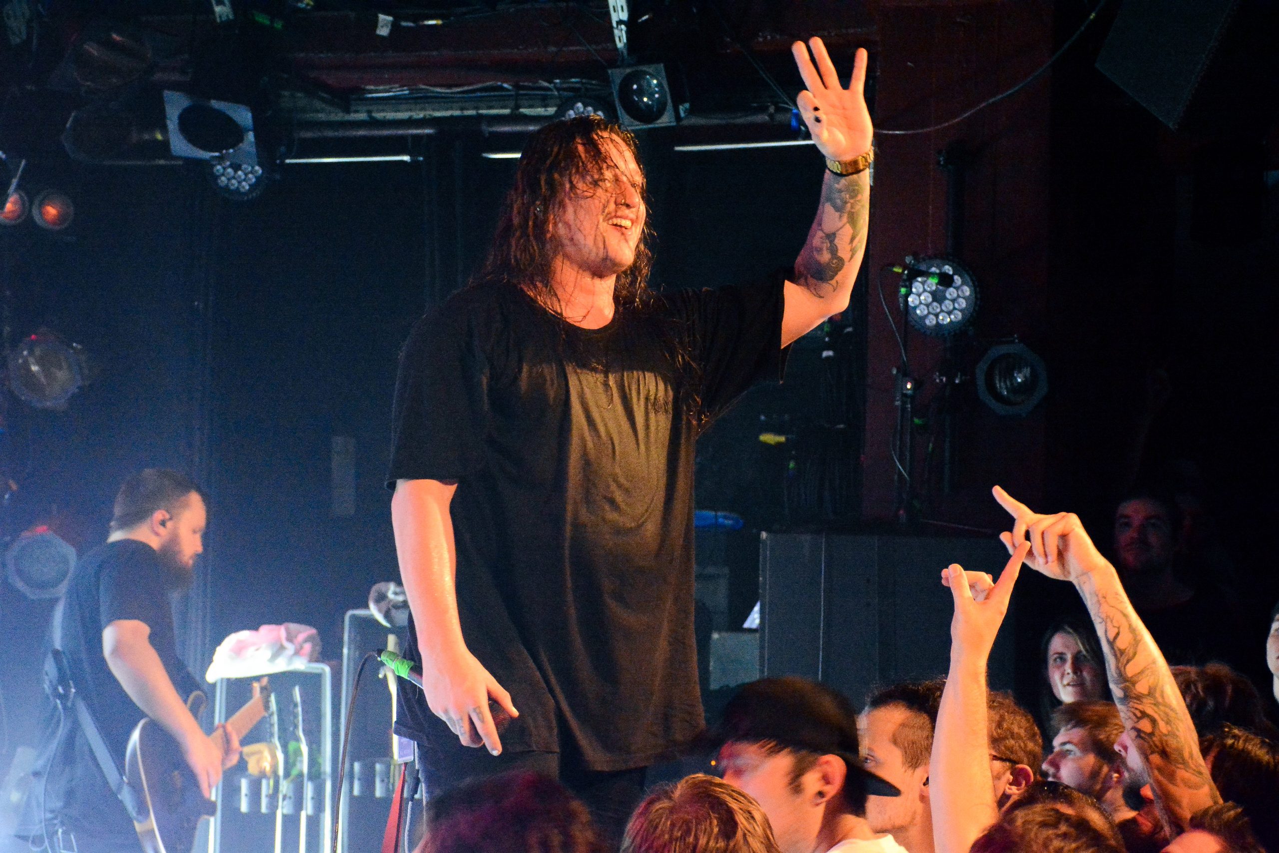 Les petits neveux d’Alphawolf débarquent ensuite. Ils ont prévu un spectacle d’acrobaties pour montrer l’étendue de leurs talents. Plus calme, vous croyez ? Ne parlez pas trop vite. Les enfants débutent leur performance avec « Ultra-Violet Violence », et semblent s’amuser follement. Leur énergie est communicative. Tellement communicative, que pendant que les bambins sautillent sur scène, le pit se transforme en chaos. Creep ne vient pas arranger les choses, les corps s’entassent tellement que la fosse ressemble à une pyramide humaine. C’est à celui qui poussera le plus pour voir le mieux son enfant faire son show. Et il faut dire que cela semble plaire à cette bande de gredins qui n’a pas prévu de faire redescendre la pression. La setlist est une vrai Roulette Russe, chaque nouveau titre est une pression supplémentaire, un carnage éventuel, sauf qu’il se trouve que le réservoir entier est plein, et que les balles en plastique des jeux d’enfants font mal, elles aussi. Il n’y a aucun répit. Ça tire à balles réelles, ce soir. Les insultes proférées durant « Sub Zero » finiront de diviser…le pit en deux. Qui s’écrasera devant l’autre, dans ce wall of death ? Personne n’est prêt à perdre. Il y a des comptes à régler, et cela se fait par le biais des enfants. Cette descente aux enfers se clôture avec la monumentale  « Akudama ». A défaut de monter sur les tables pour protester, les crowdsurfeurs montent sur les mains et parsèment la salle. Tous le monde, groupes et fans pour participer à cette ultime dispute. On envoie tout valser, on se tabasse, on se menace. Il est temps d’arrêter les frais et de couper court avant qu’un drame n’arrive.